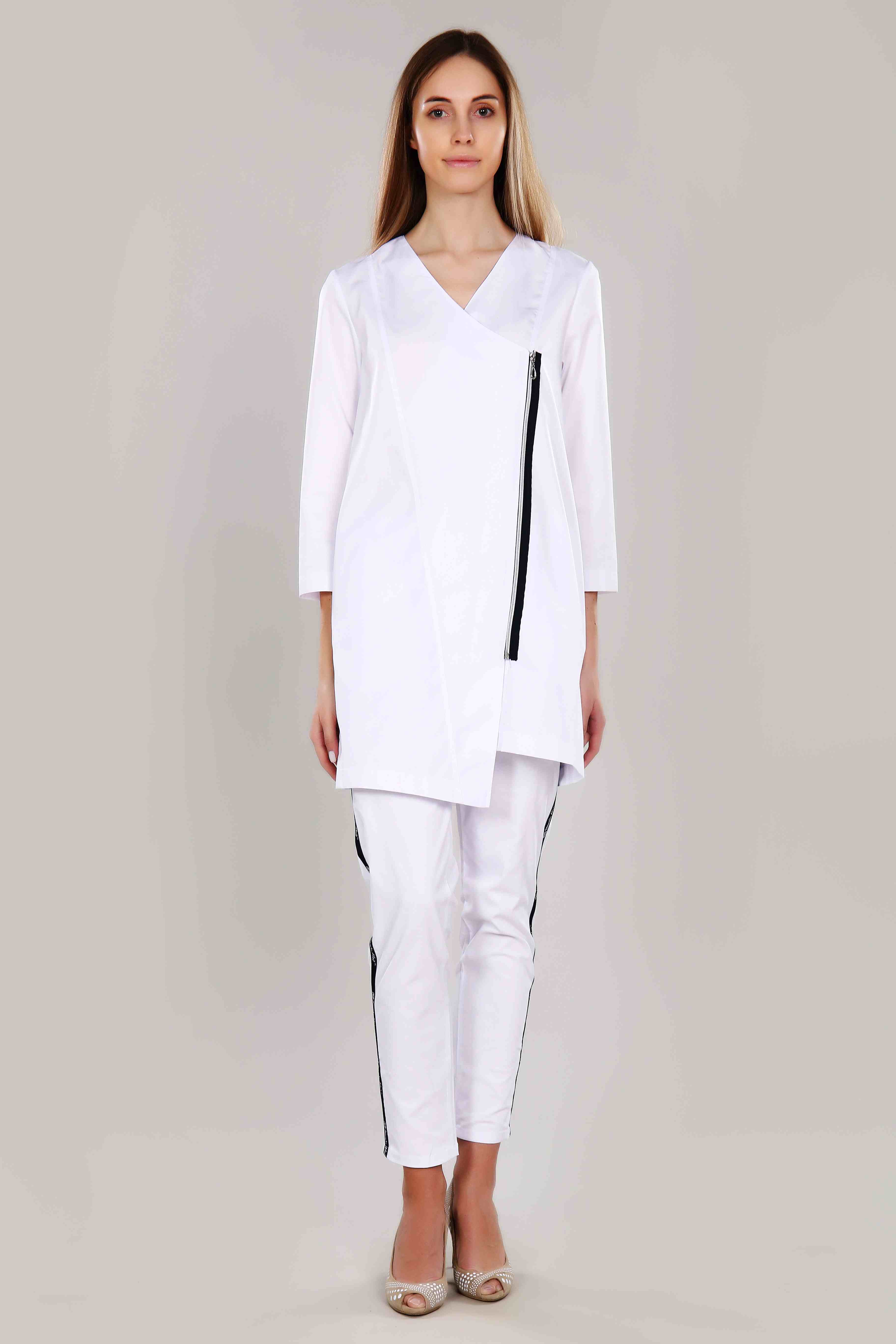 Красивый, стильный женский медицинский белый халат, премиум класса. Спецодежда сшита из легкой качественной ткани с высоким содержанием хлопка, практичная, комфортная и проста в уходе, ткань приятная к телу. Сложность конструктивных линий гармонично вписана в силуэт спецодежды для медицинского персонала. Данный белый халат с v образным вырезом, без воротника, два боковых кармана, центральная застежка на молнии,рукав 3/4. Рост 164-170 см.