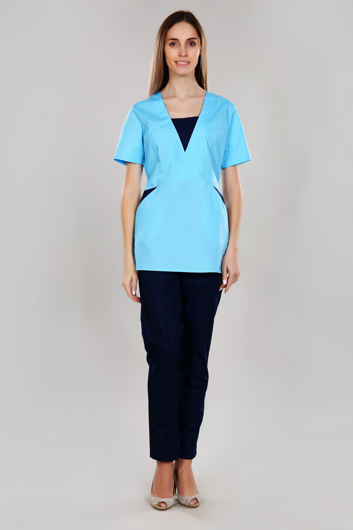 Женский медицинский костюм состоящий из блузы с коротким рукавом и брюк, зауженных к низу. Горловина выполнена в виде v-образного выреза, линия талии регулируется резинкой. Костюм изготовлен из высококачественной ткани, Тиси. Ее состав - 65% полиэфир, 35% хлопка, плотность составляет 120 гр/кв.м. Ткань легкая, прочная, она долговечна и проста в уходе. Размеры с 42 по 56.