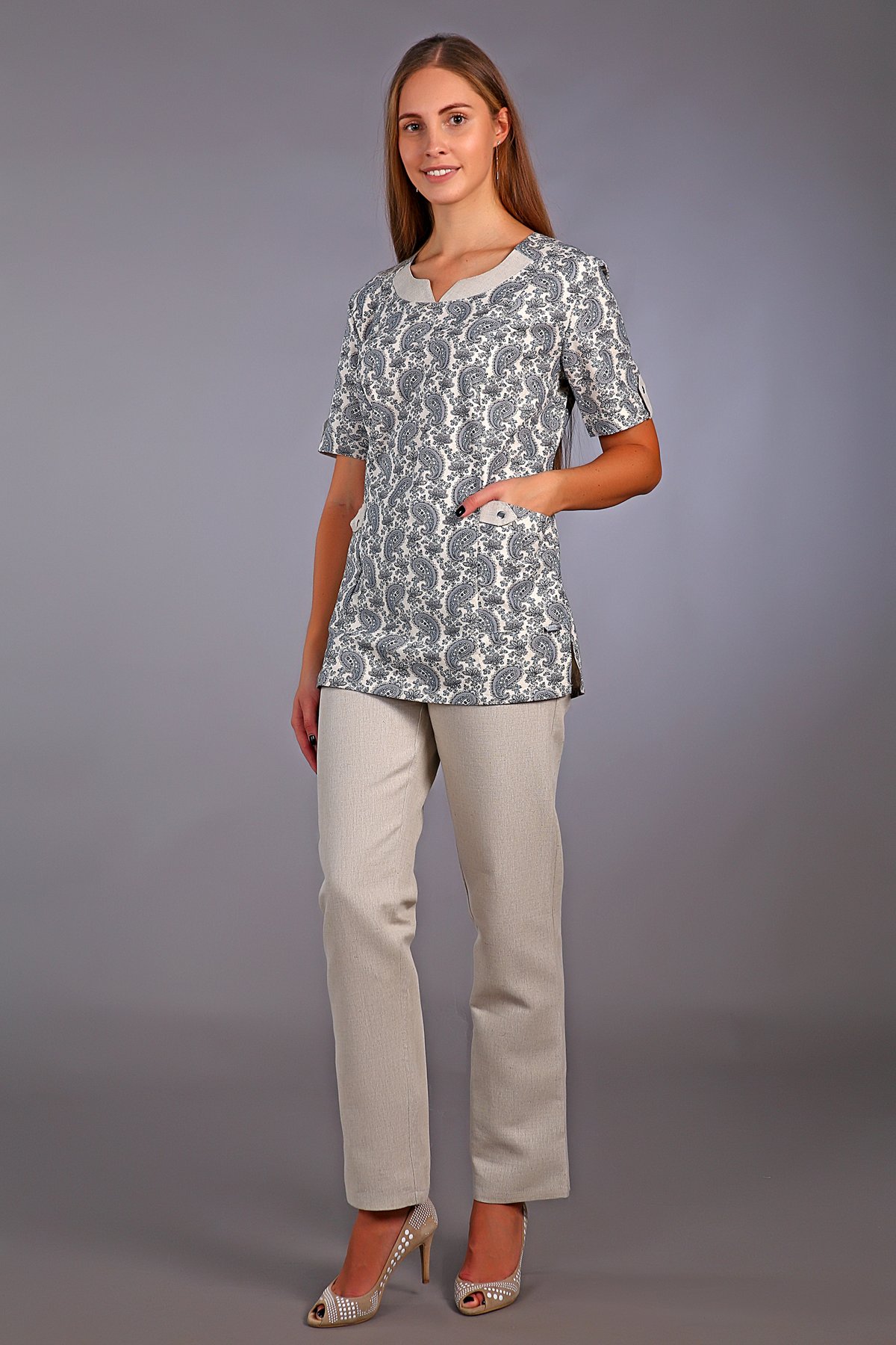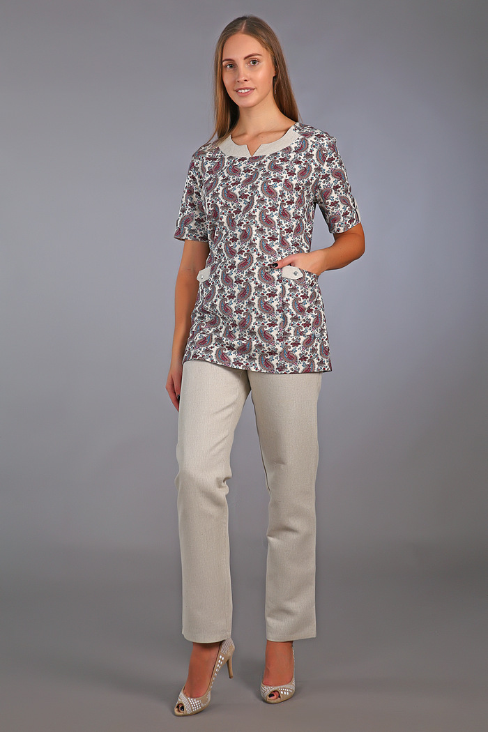 Костюм медицинский имеет большой размерный рядс 42 по 62 . Прекрасный и стильный медицинский костюм женский, чье высокое качество и удобная посадка гарантированы со стороны производителя. В основе изделия - 50% хлопок, 50% лен. Смесовая ткань дышит и приятна к телу. Спецодежда свободного покроя, обеспечит легкость и непринужденность в движениях. Униформа состоит из блузы и брюк. Верх с коротким рукавом и утонченным, V-образным вырезом горловины. Имеет боковые накладные карманы, которые непременно пригодятся в процессе работы. Брюки  длинные, прямые, на удобной резинке в поясе. Спецодежда выглядит очень выдержано и эстетично, создаст элегантный и женственный образ. Грамотное сочетание цветовой гаммы с интересным дизайном сделает ваш рабочий образ по-настоящему достойным и стильным.