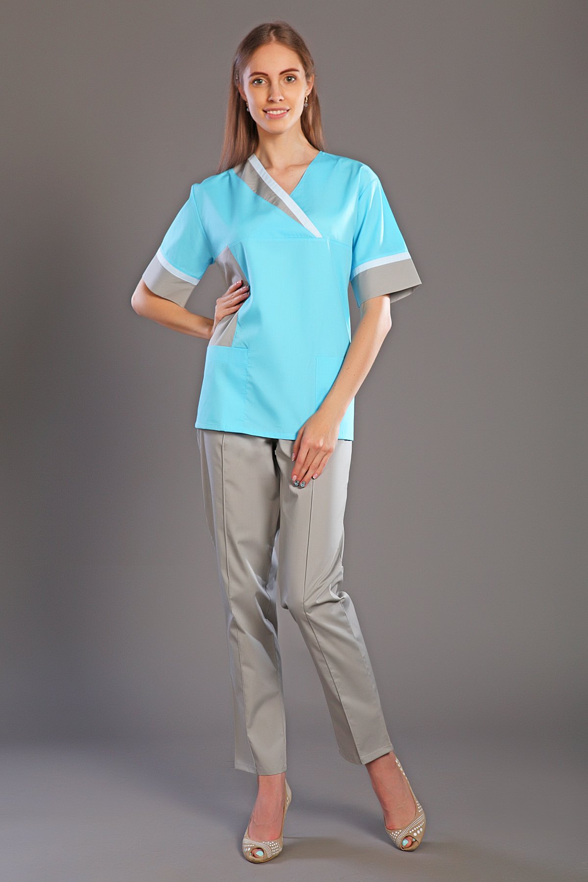 Медицинский женский костюм состоит из блузы с короткими рукавами и брюк. Блуза с эффектным Vобразным вырезом горловины, двумя накладными карманами. Полочка, горловина и манжеты рукавов оформлены вставками из ткани в цвет брюк. Брюки классические, прямые.Изготовлен из ткани ТИСИ, с составом 35% хлопка и 65% полиэфира в плотности 120г/м2. Размерный ряд 42 - 56.