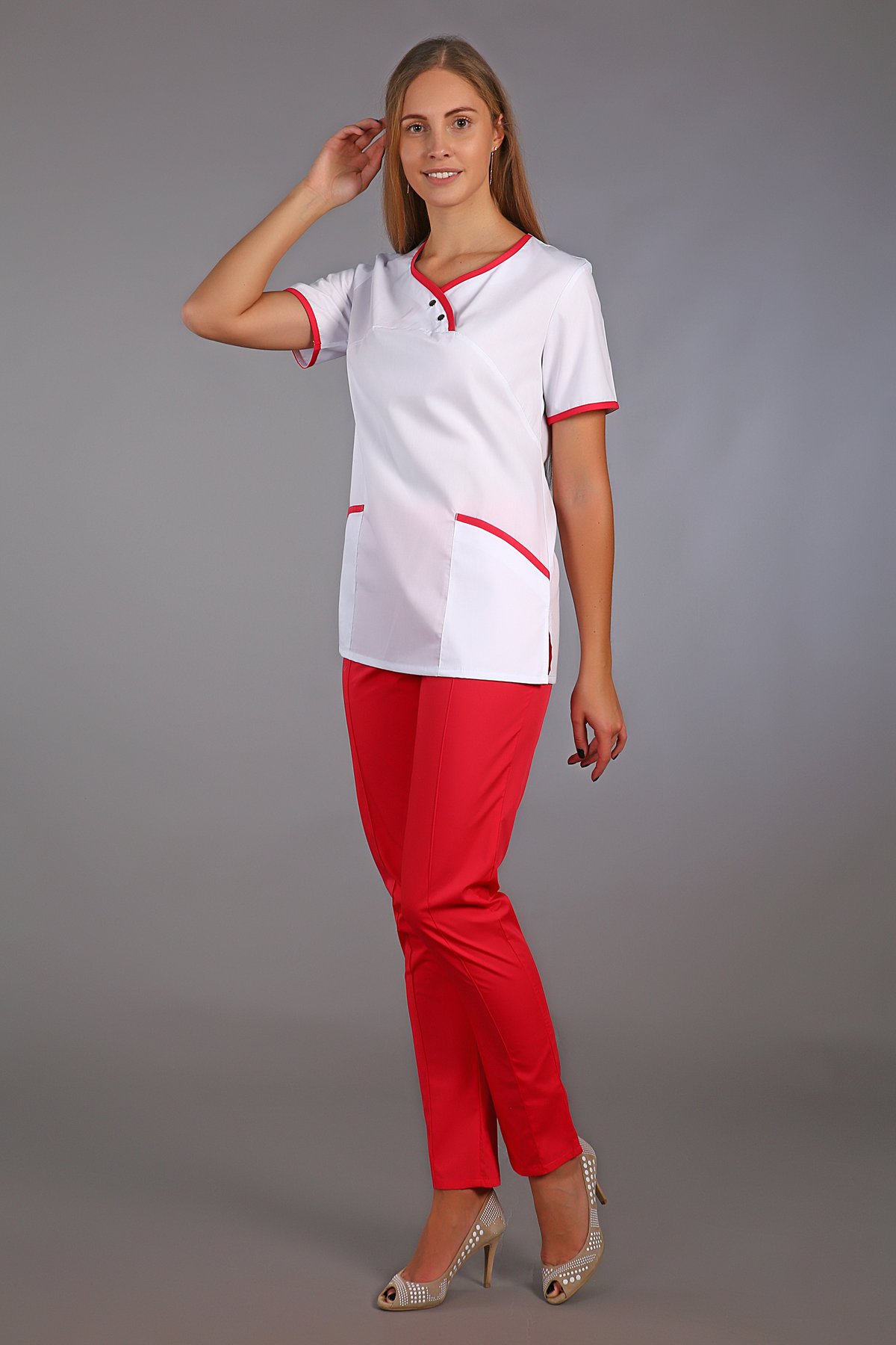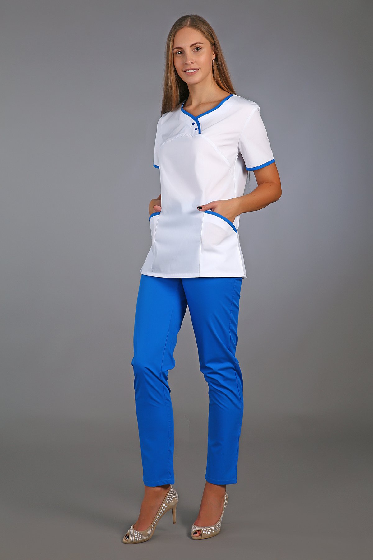 Женский медицинский костюм М-180, В комплект входит блуза с неглубоким фигурным вырезом и брюки с декоративной стрелкой. Края обработаны кантом в цвет брюк, что делает образ цельным, сшит костюм из специальной ткани ТиСи( 35% хлопок, 65% полиэфир с ВО пропиткой. Размерный ряд 40- 64, Рост 164 – 170 см