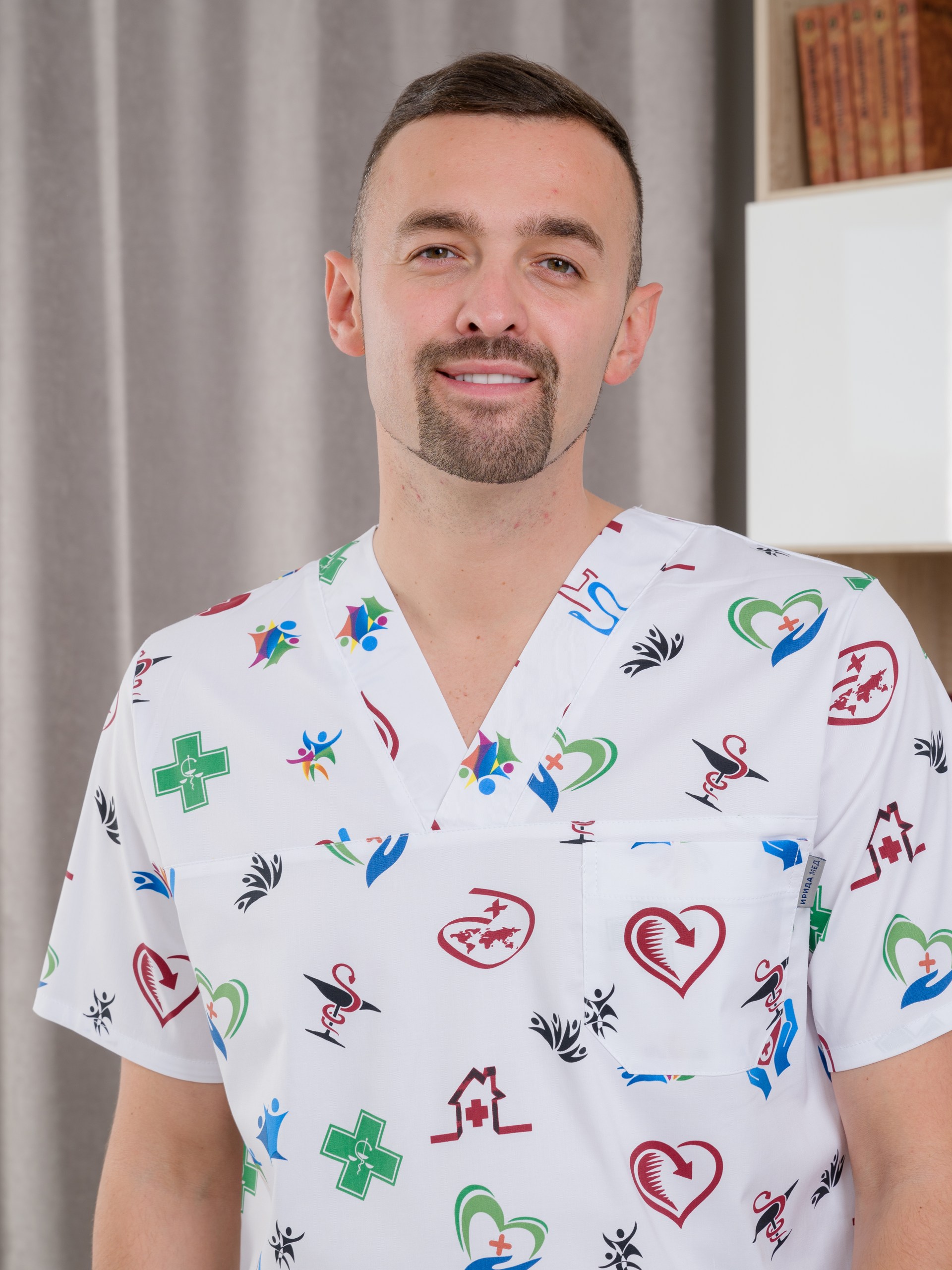 Жакет медицинский хирургический мужской прямого силуэта с V- образной горловиной и коротким рукавом. Наличие трех карманов: два нижних и один нагрудный. Широкие рукава блузы подарят свободу движения и комфорт. Данная модель подходит для следующих категорий использования: рубашка хирурга, врача, медбрата, работника скорой помощи, ветеринара, косметолога, парикмахера, клининга, массажиста. Медицинский жакет представлен размерным рядом с 44/46 по 64/66. Спецодежда сшита из ткани Стрейч/Принт с составом ткани (35%хл, 63%п/э,2%эластан). Это спецодежда высокого качества для специалистов с хорошим вкусом.