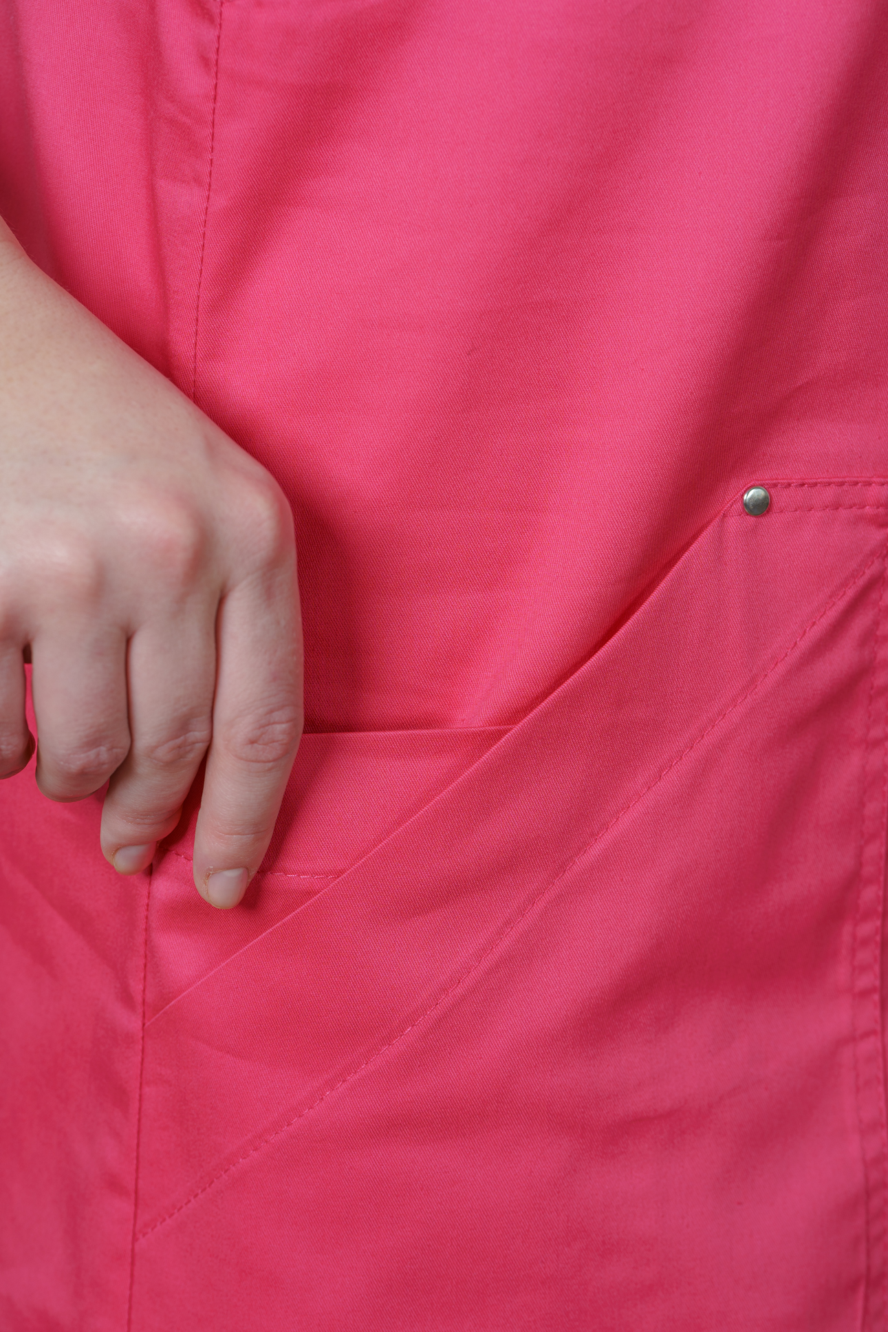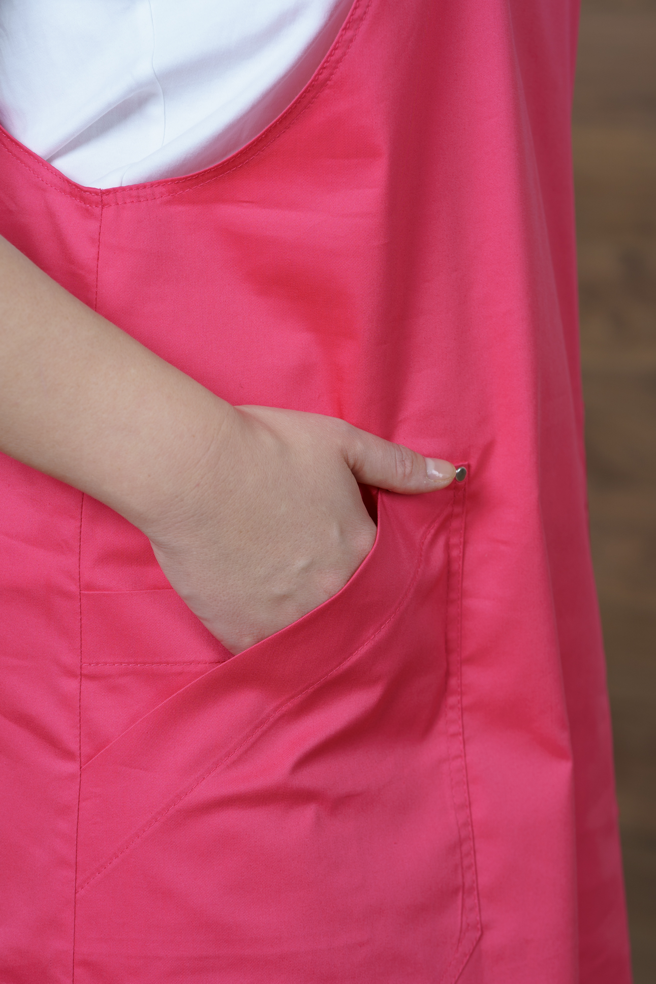 Данная модель сарафана  подойдет специалистам многих сфер деятельности: медицинскому работнику, врачу, медсестре, косметологу, парикмахеру, бьюти-специалисту, грумеру, массажисту. Данная модель имеет  полуприлегающий силуэт, застегивается на клепки на уровне плеч. Два боковых накладных кармана.