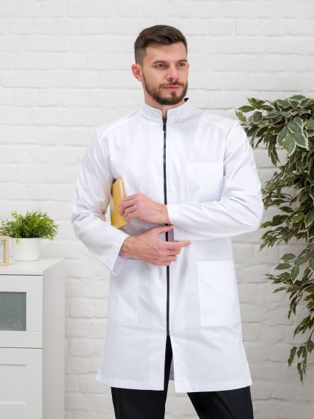 Халат медицинский мужской имеет большой размерный ряд (от 46 до 60). Униформа изготовлена в белом цвете. Обратите внимание на этот медицинский халат на молнии с длинным рукавом, воротником стойкой и тремя накладными карманами: 1 находится на груди, 2 других - снизу по бокам. Такой материал легкий в уходе и износостойкий.