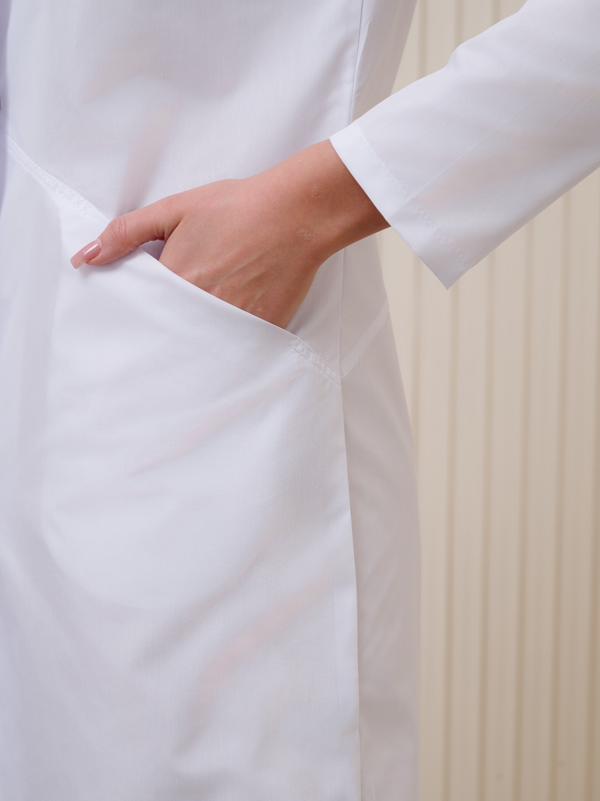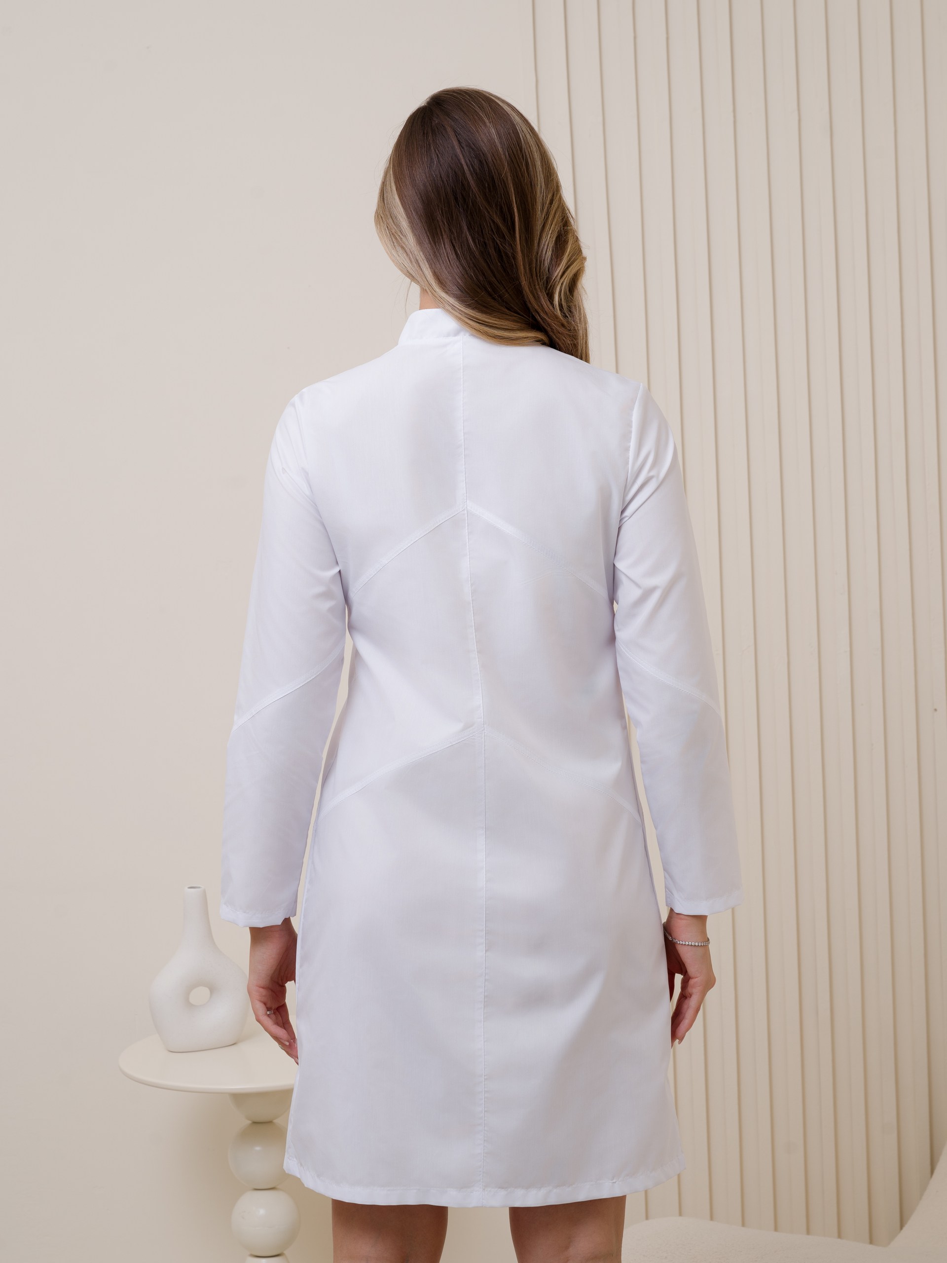 Халат  женский приталенного силуэта на кнопках. Воротник стойка, рукав длинный. Ткань Тиси (35%хл, 65%п/э) плотность 120 гр. на кв. метр. Белый медицинский халат подходит для повседневного использования как для медиков уже работающих по специальности, так и для студентов. Такая спецодежда бдет отлично вписана в арсенал вашего рабочего гардероба. Наш бренд производит только качественную, функциональную рабочую одежда для людей, которые ценят красоту, эстетический внешний вид и удобство за доступную цену.