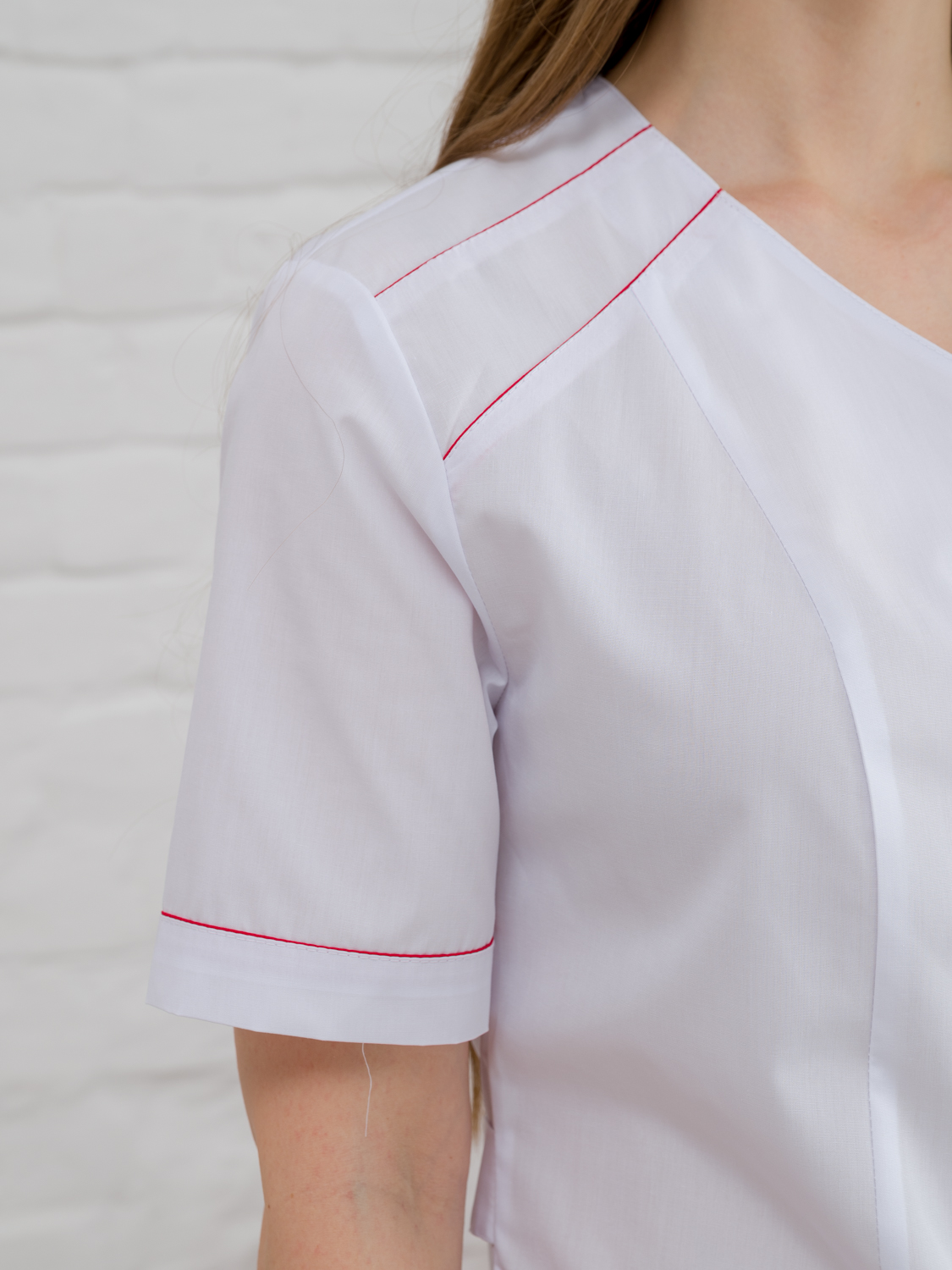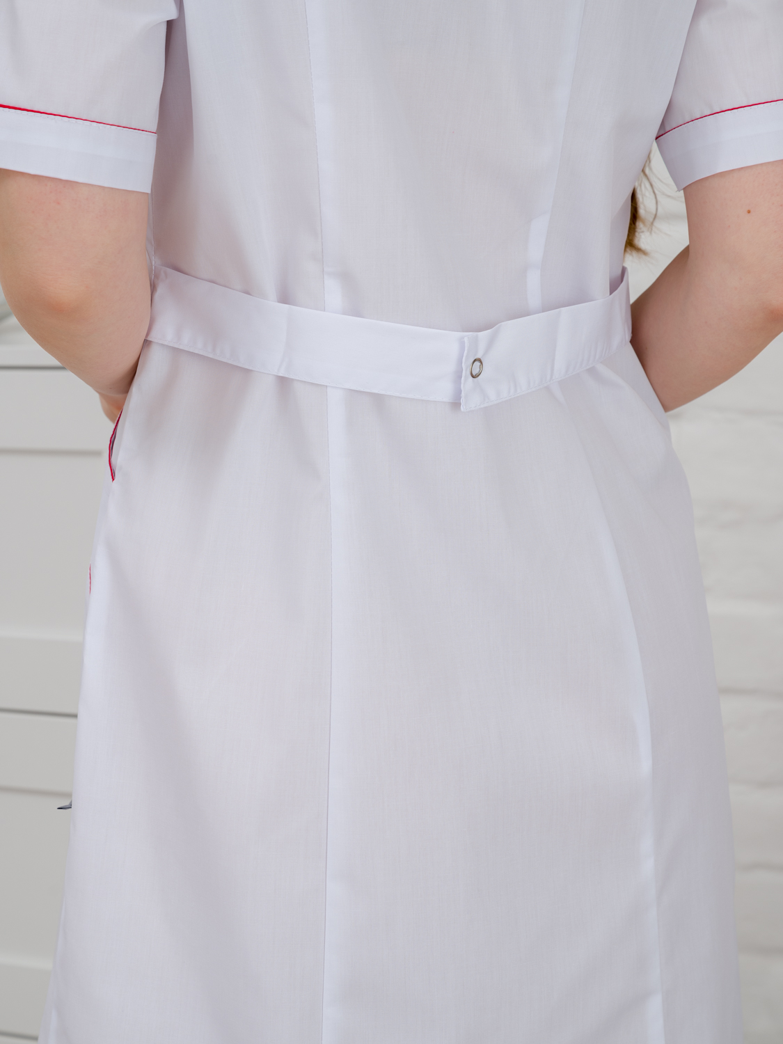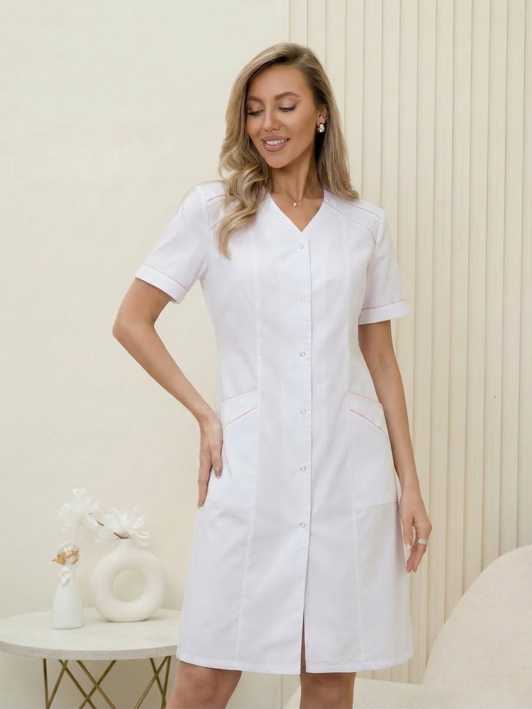 Медицинский женский халат прилегающего силуэта. Застежка центральная на кнопки или пуговицы. Vобразный вырез горловины, рукав короткий. По бокам удобные карманы. Рукава, кокетка и карманы обработаны кантом. Медицинский халат - неотъемлемый атрибут любого медицинского работника. Он служит не только для защиты от возможных инфекций, но и является визитной карточкой врача или медсестры. Ткань дышащая, проста в уходе. Идеальный вариант одежды для работников медицины.