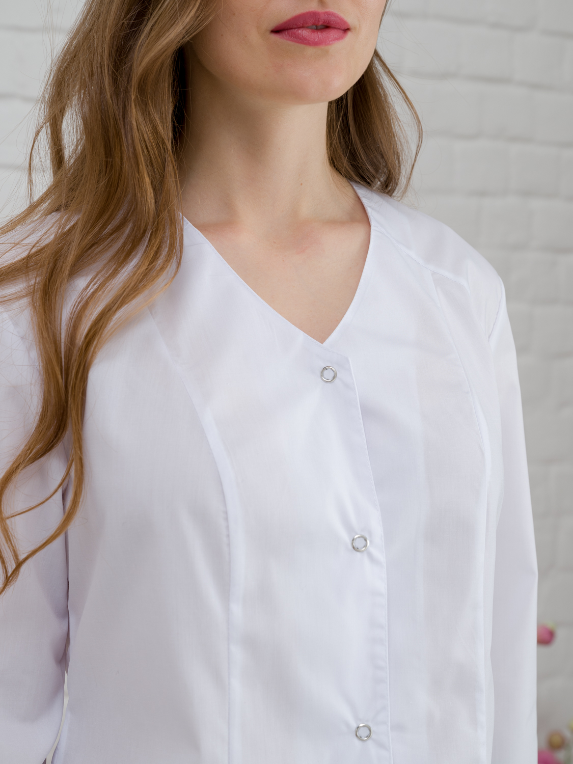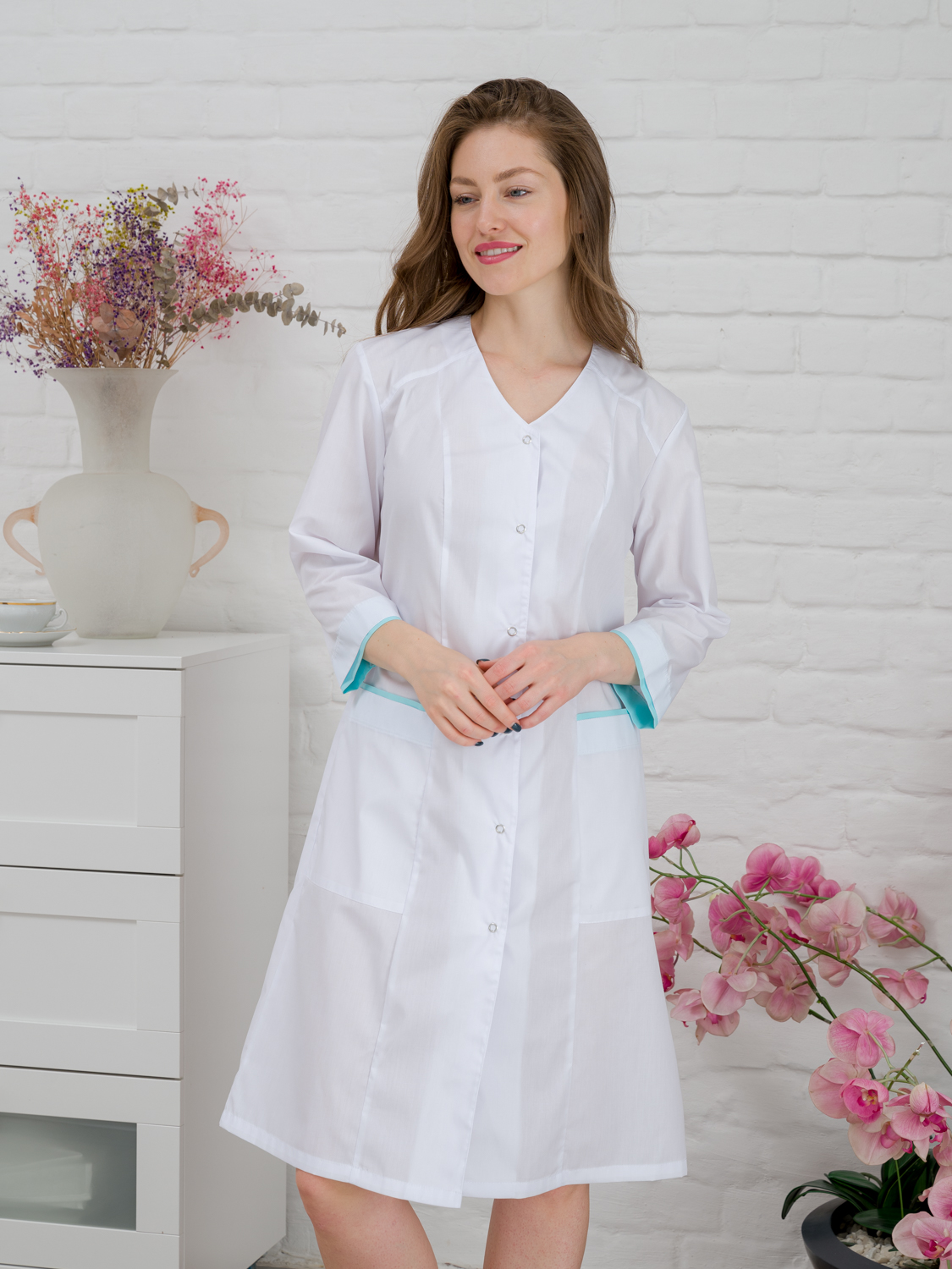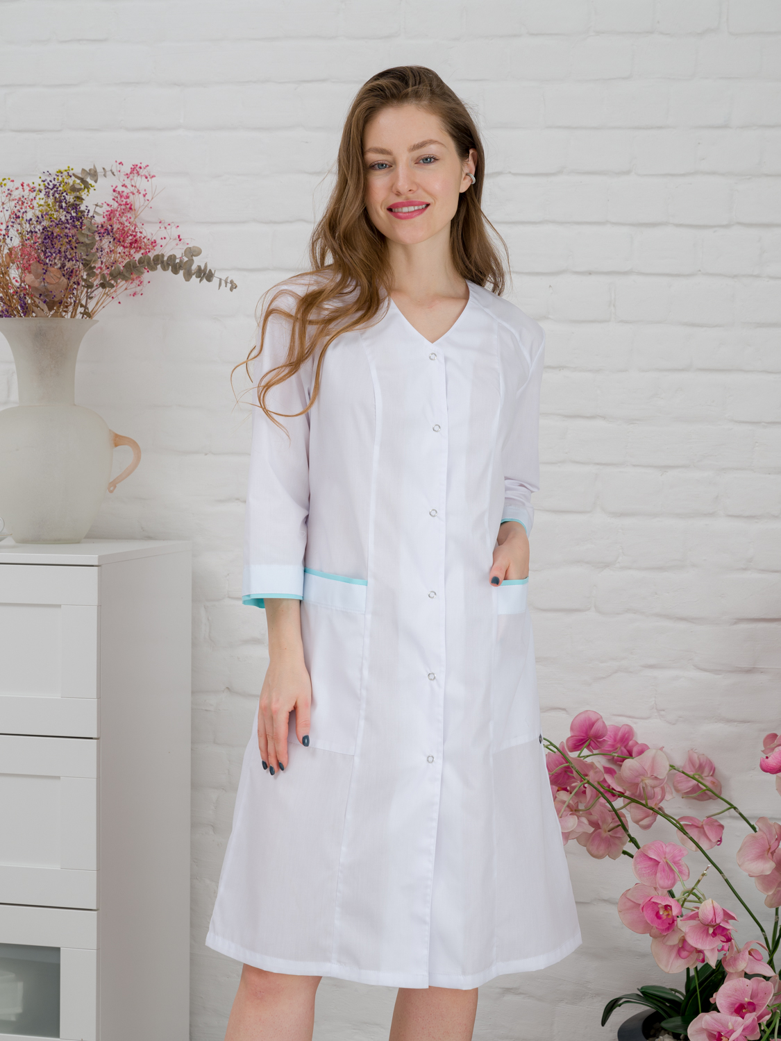 Медицинский женский халат прилегающего силуэта. Застежка центральная на кнопки. Vобразный вырез горловины, рукав короткий. По бокам удобные карманы. Рукава, кокетка и карманы обработаны кантом. Медицинский халат - неотъемлемый атрибут любого медицинского работника. Он служит не только для защиты от возможных инфекций, но и является визитной карточкой врача или медсестры. Ткань дышащая, проста в уходе. Идеальный вариант одежды для работников медицины.