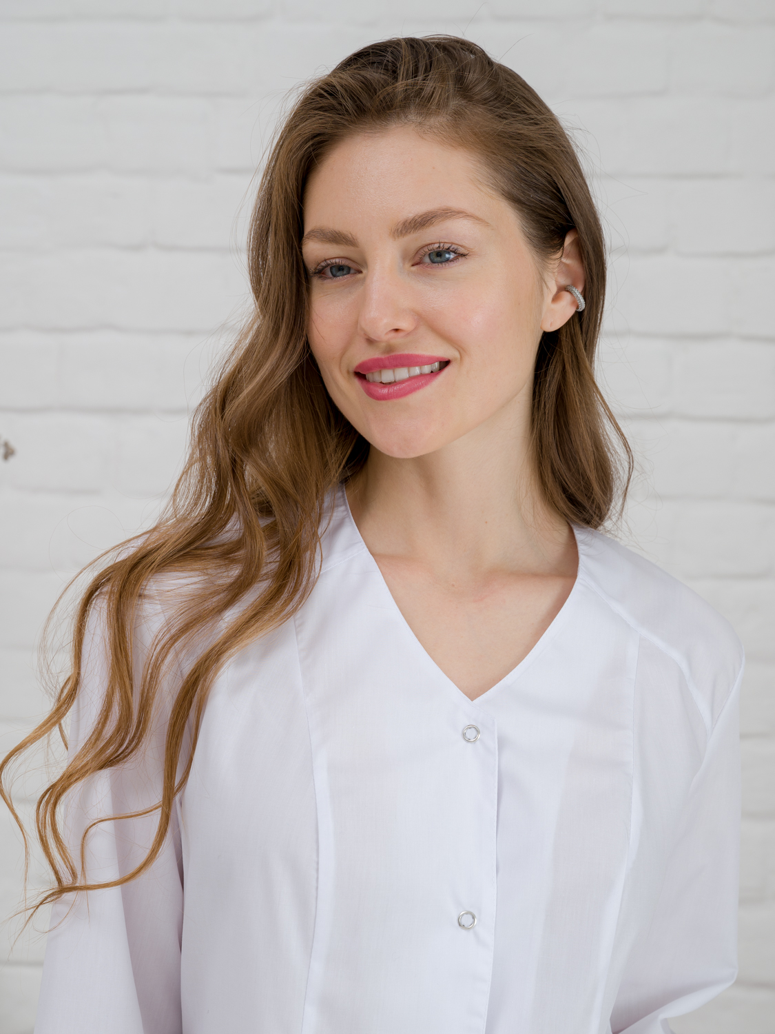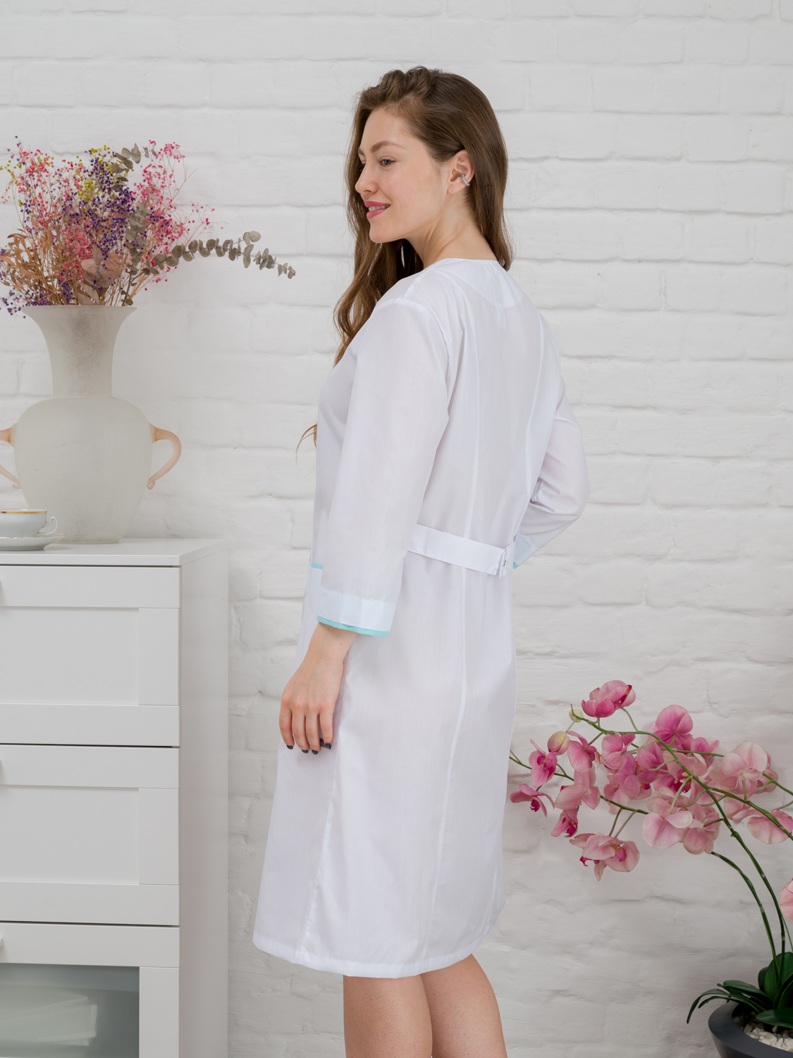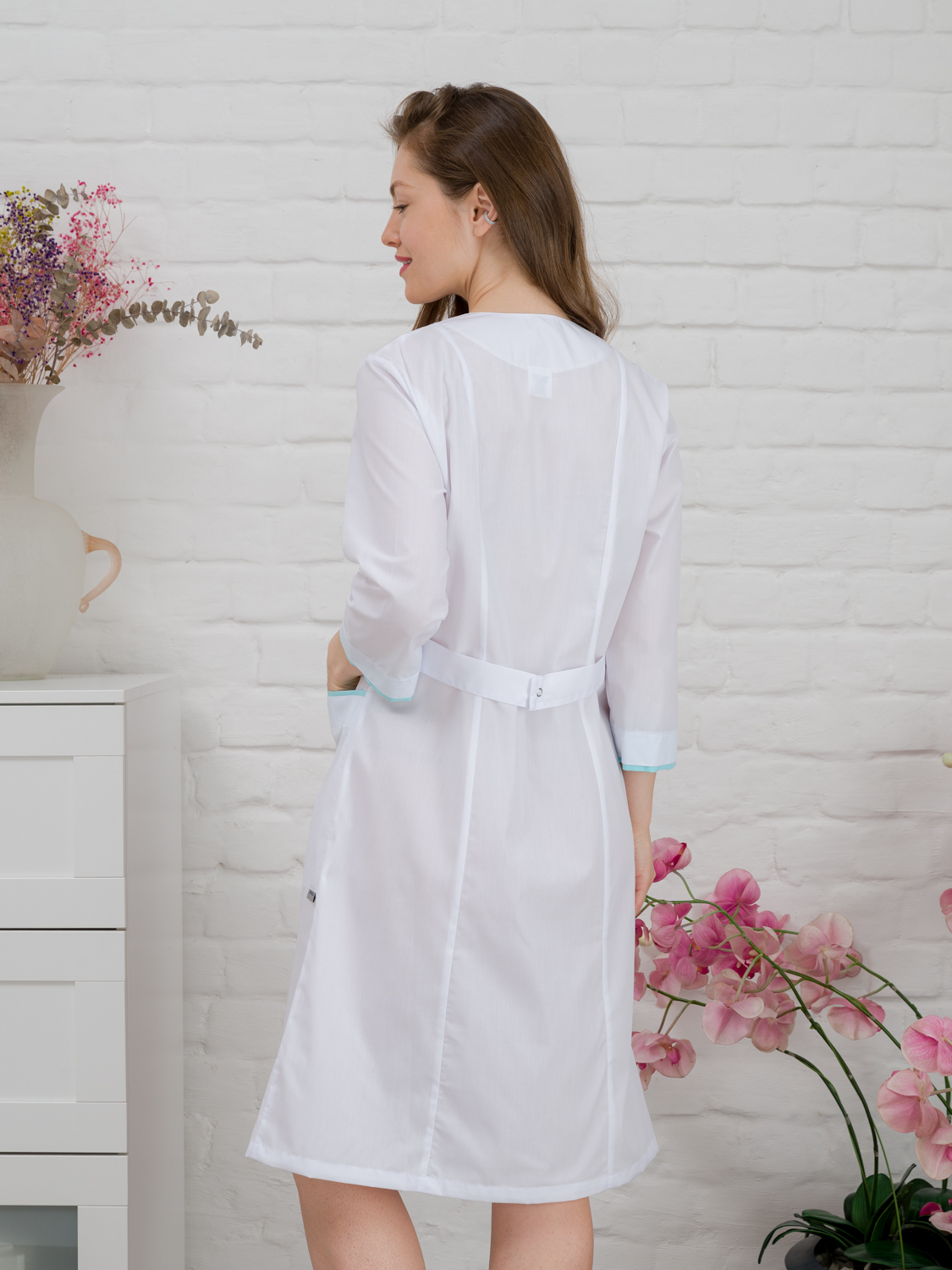 Медицинский женский халат прилегающего силуэта. Застежка центральная на кнопки. Vобразный вырез горловины, рукав короткий. По бокам удобные карманы. Рукава, кокетка и карманы обработаны кантом. Медицинский халат - неотъемлемый атрибут любого медицинского работника. Он служит не только для защиты от возможных инфекций, но и является визитной карточкой врача или медсестры. Ткань дышащая, проста в уходе. Идеальный вариант одежды для работников медицины.