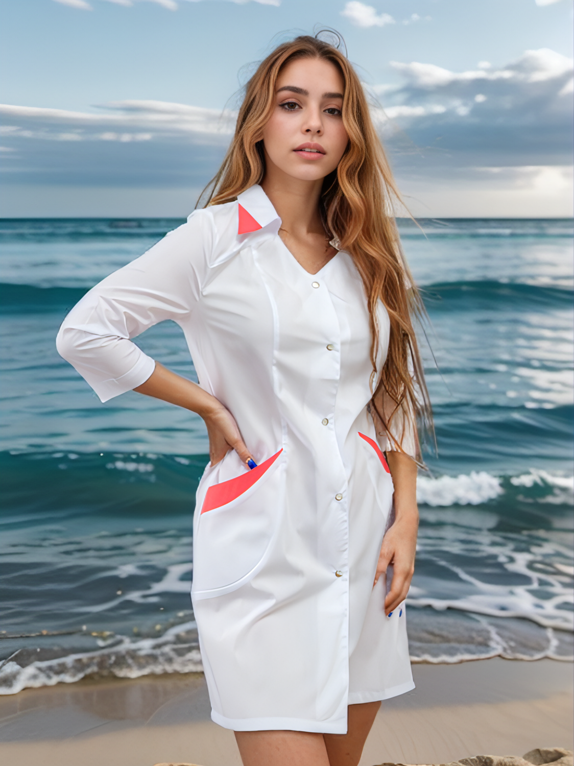 65% п/э, 35% хл.; пл. 120. Размер: 40-52. На кнопках. Цвет отделки указывайте в комментарии к заказу.
