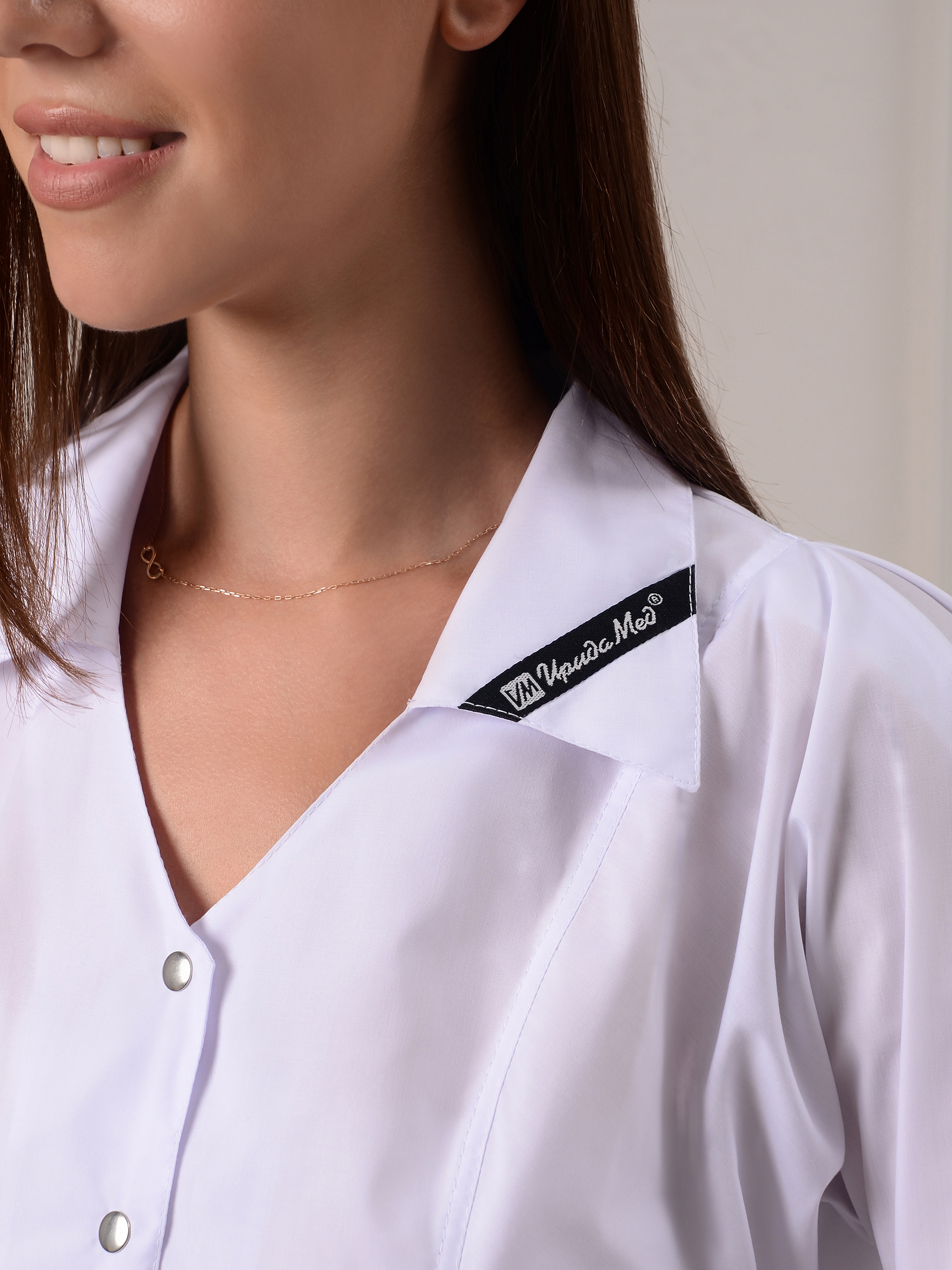 Халат медицинский женский. Отрезная талия, цельнокроеный рукав, длина 3/4 с манжетой, с мягкой складкой на плече. Юбка коническая расклешеная.На уголке воротника и по шву талии настрочена черная репсовая лента с логотипом производителя. Ткань: Тиси. Состав:65% п/э, 35% хлопок; плотность 120. Размеры с 42-54. Застежка: металлическая кнопка с логотипом производителя.