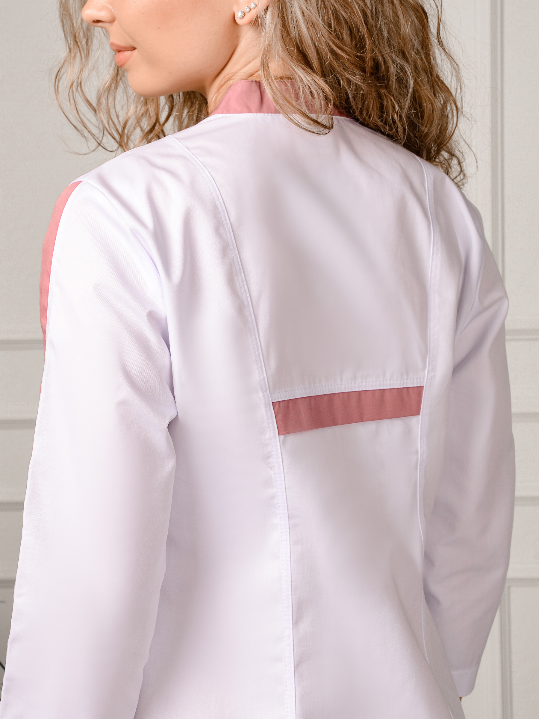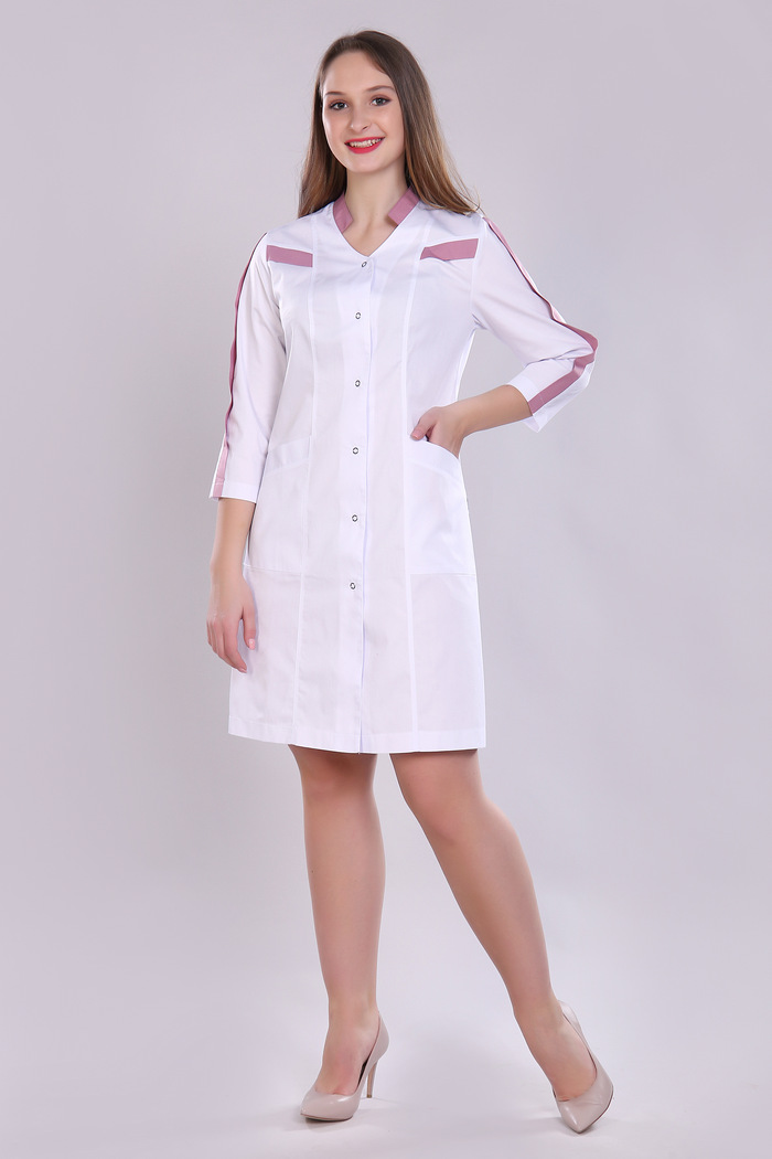 Халат предоставлен широким размерным рядом: 42-70. Прекрасный и стильный женский халат, чье высокое качество и удобная посадка гарантированы со стороны производителя. В основе изделия - 50% хлопок, 50% полиэфир. Смесовая ткань дышит и приятна к телу. Спецодежда полуприлегающего кроя, обеспечит легкость и непринужденность в движениях. Униформа с 3/4 рукавом и V-образным вырезом горловины. Белый халат имеет отделку пудрового цвета и боковые, накладные карманы, которые непременно пригодятся в процессе работы. Застегивается на удобные кнопки. Спецодежда выглядит очень выдержано и эстетично, создаст элегантный и женственный образ. Грамотное сочетание цветовой гаммы с интересным дизайном сделает ваш рабочий образ по-настоящему достойным и стильным. Подойдет разных возрастов и с разным типом фигуры.