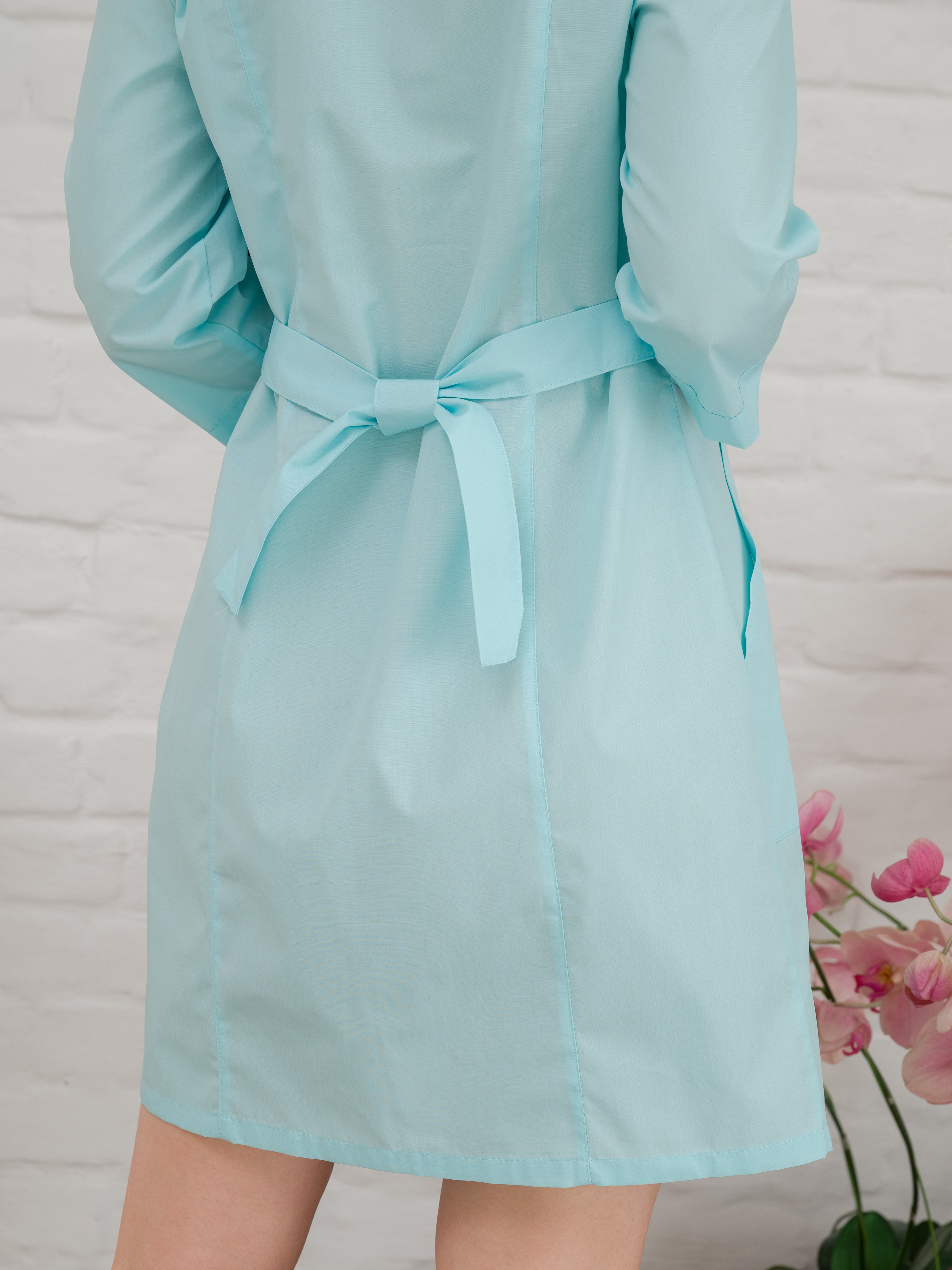 Халат медицинский имеет широкий размерный рядот 38 до 60. Цветной женский медицинский халат на клепках. Халат с рукавом 3/4 имеет отложной V-образный воротник и длину до колена. Униформа оснащена двумя боковыми накладными карманами, подвязывается двумя полупоясами. Изделие подходит для повседневного использования. Сшит из смесовой ткани 35% хлопковое волокно и 65% полиэфир.