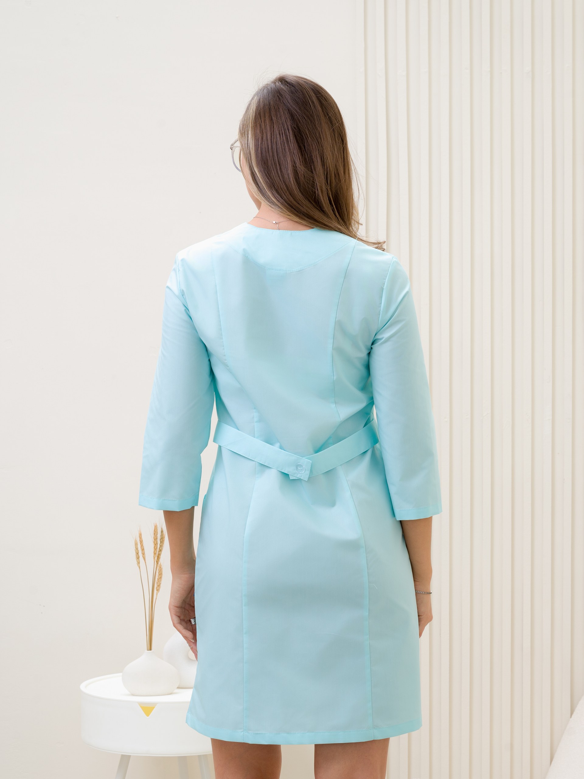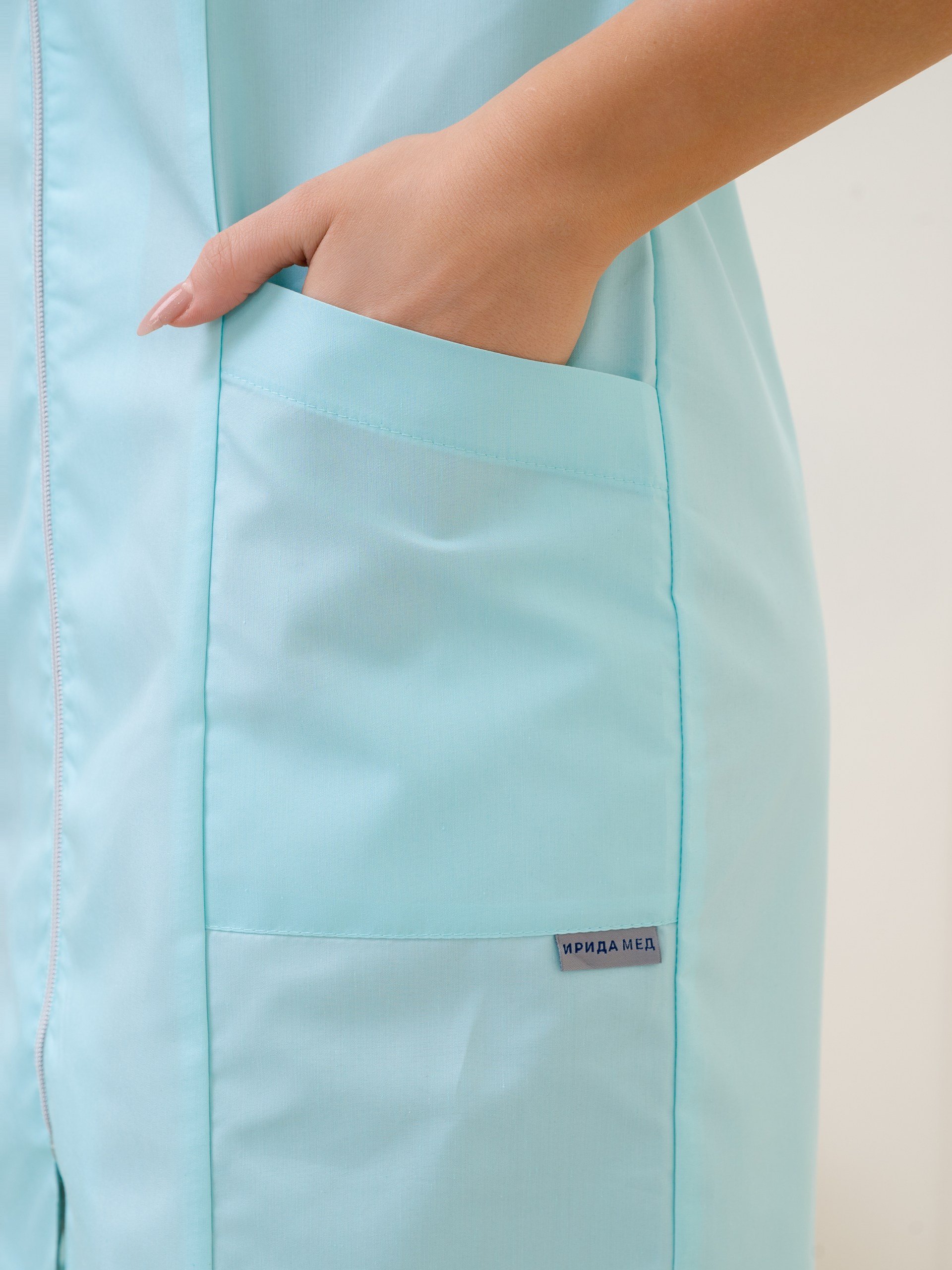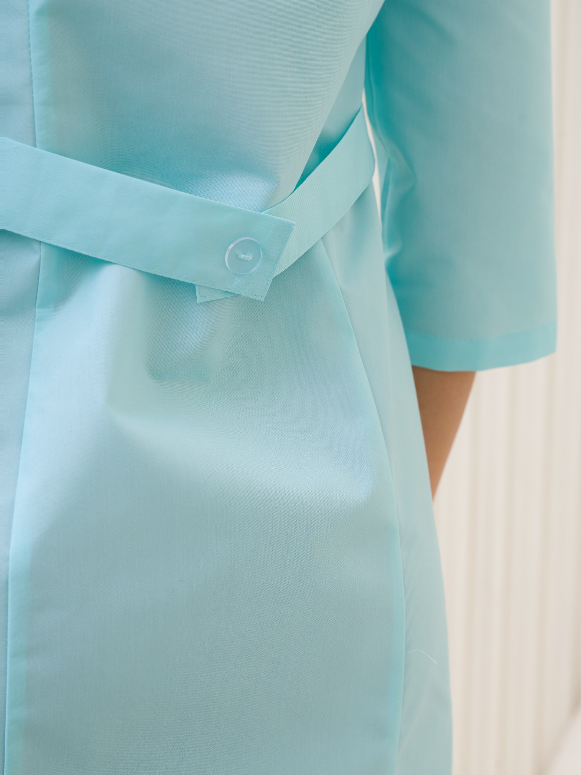 Классический, медицинский, женский халат в цвете св.бирюза(2) на молнии, без воротника и рукавом 3/4. Широкий размерный ряд с 42 по 60 размер. Смесовая ткань ТиСи, содержанием хлопока 35% и полиэфира 65%, с плотностью 120г/м2, имеющий ВО пропитку.