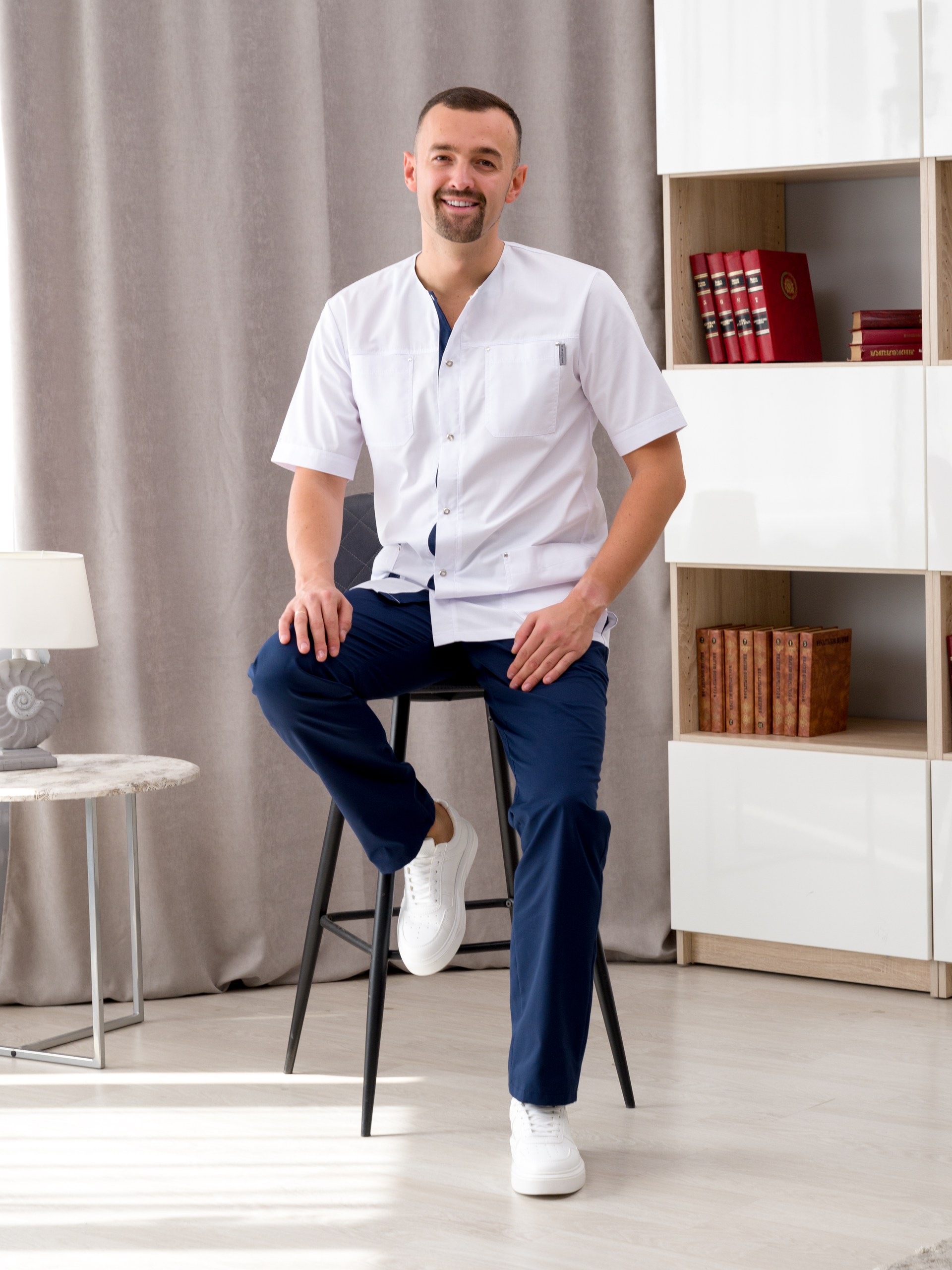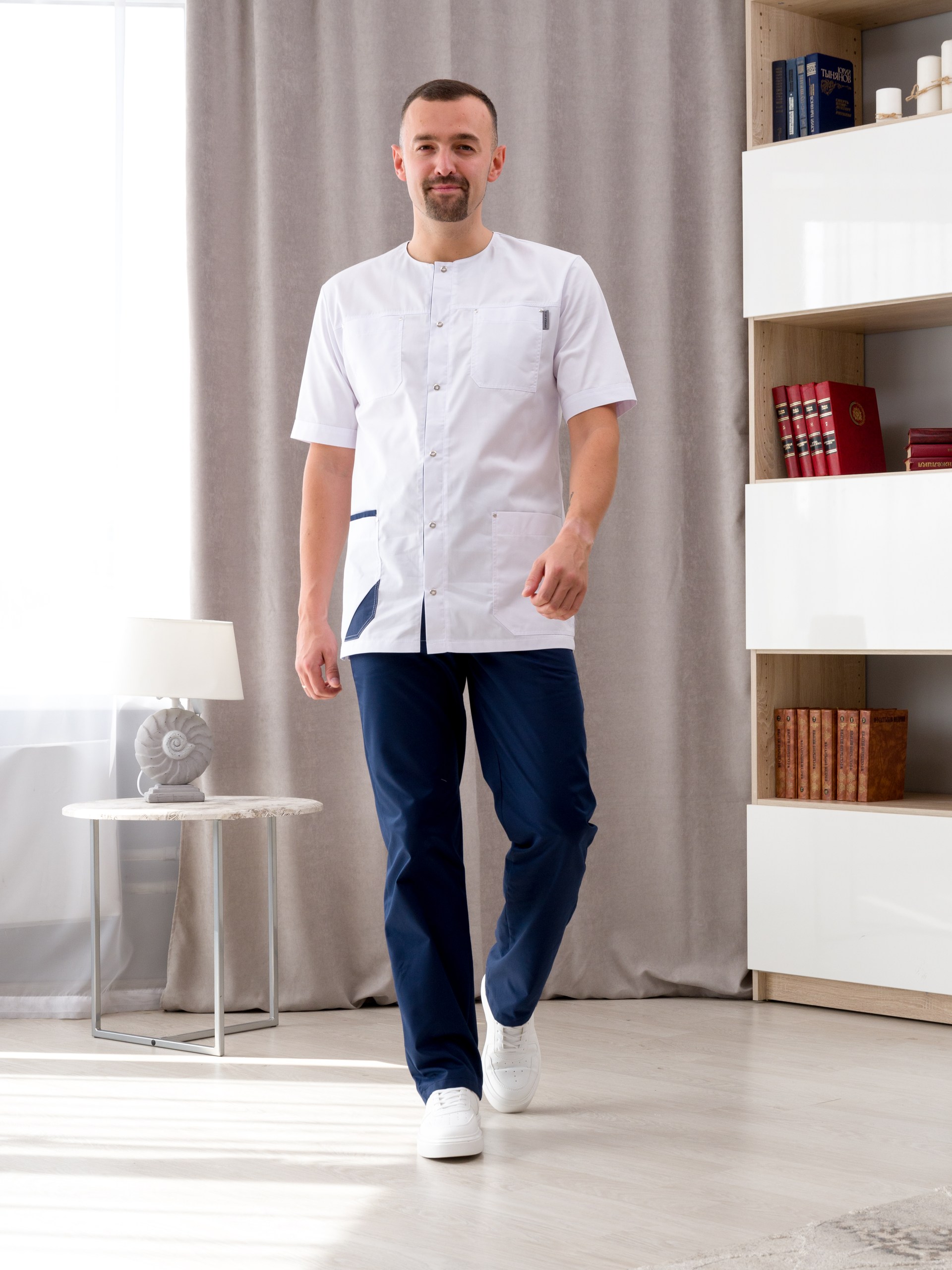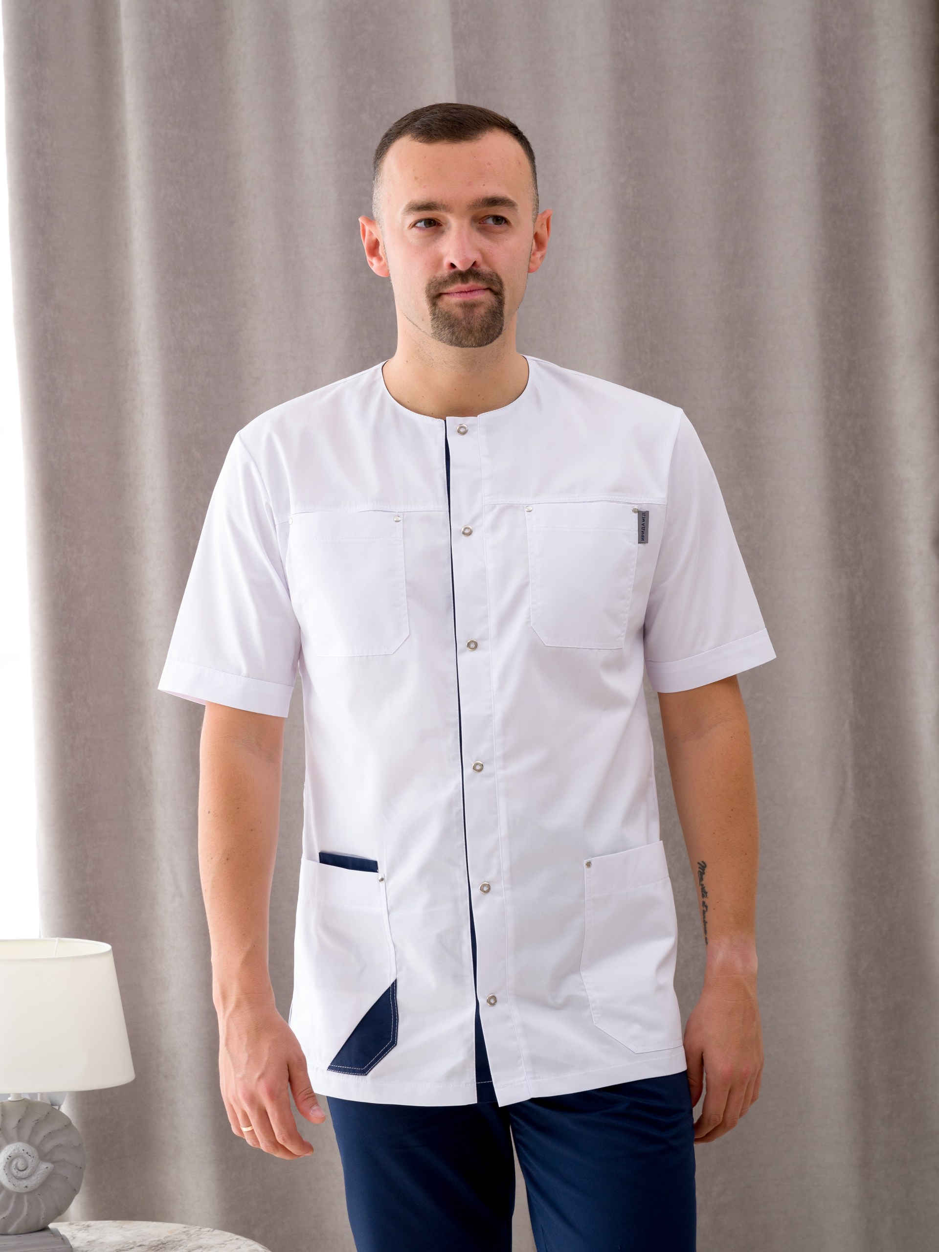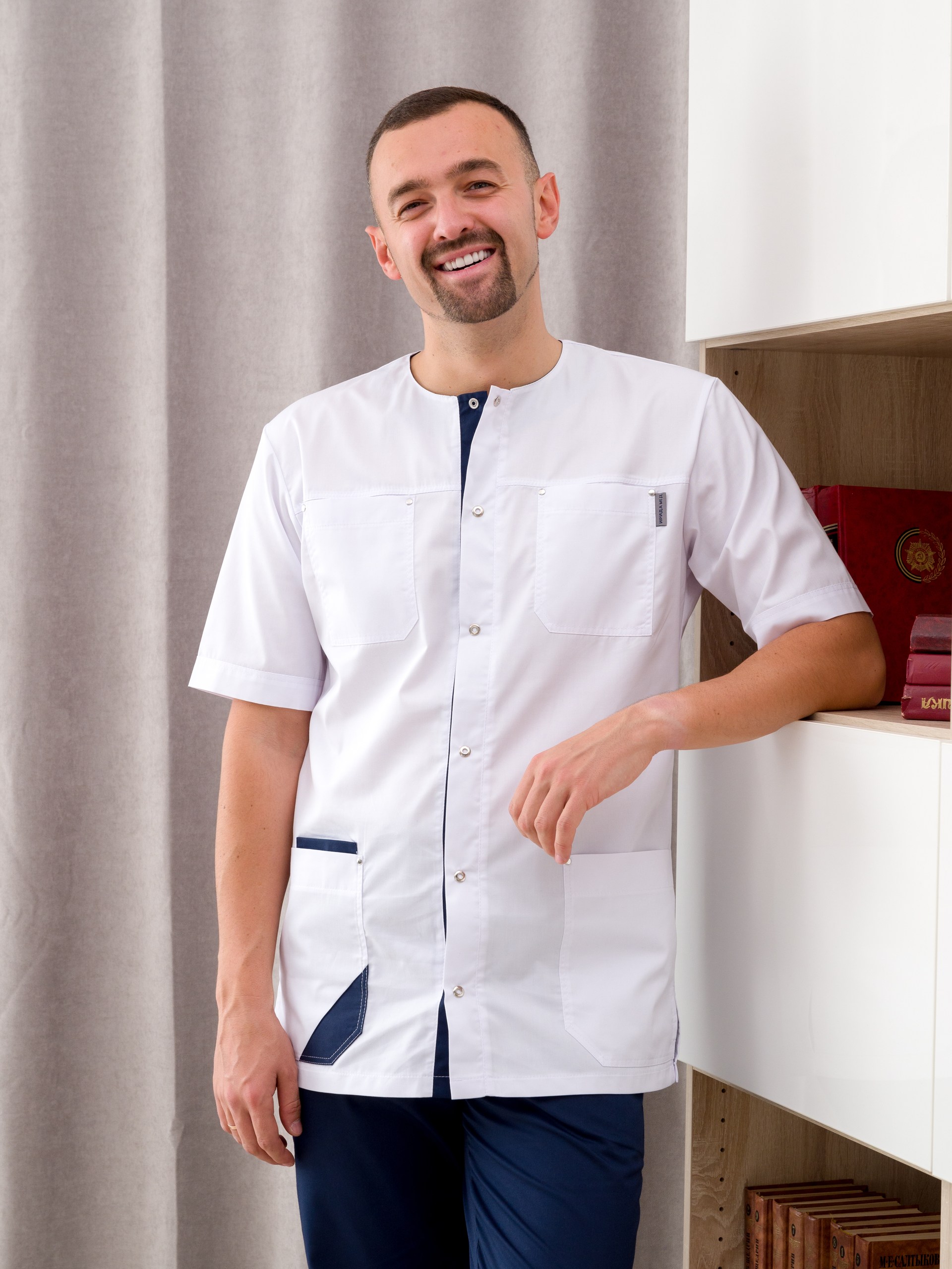Медицинская одежда мужская от "Ирида - Мед", для тех, кто ценит качество, комфорт и красоту. Униформа готова к заказу в  цветах белый/черника и белый/серый. Подходит для медиков, укомплектован рубашкой и брюками. Рубашка с коротким рукавом и круглым вырезом горловины так-же имеет 4 накладных кармана: 2 находится на груди, 2 других - снизу по бокам. Брюки прямого кроя, без застежки, по бокам в швах карманы. Состав данного изделия: хлопок 50%, полиэфир 50%, ткань "Элит-145". Такой материал легок в уходе, износостойкий, устойчив к образованию катышков, стрелок, зацепок. Мед костюмы подойдут как для медиков, ветеренаров, так и для студентов. Мы выпускаем только стильную, функциональную и красивую медицинскую униформу. У спецодежды нашего бренда есть как маленькие, так и большие размеры. Размерный ряд 46 - 60.