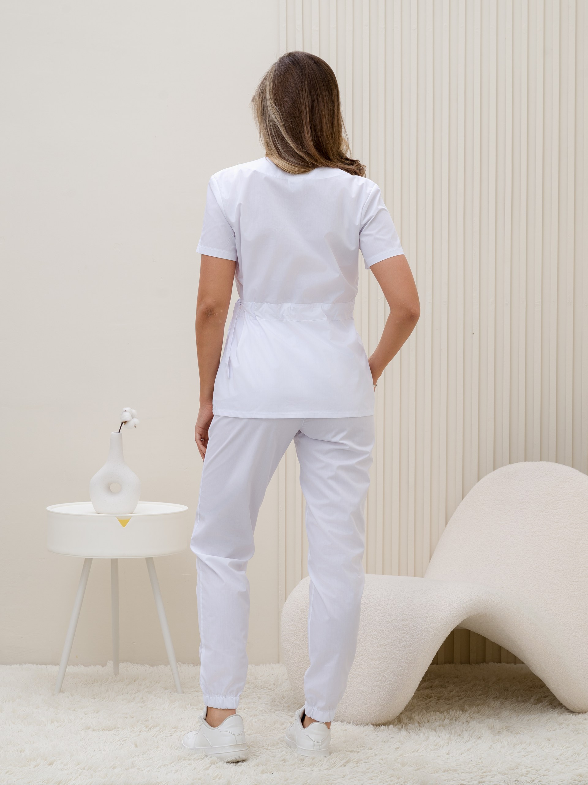 Костюм медицинский жен. М-112-0 ткань Тиси состоит из жакета и брюк. Жакет с короткими рукавами, V-образный вырех, запашной, на кулиске, имеются два боковых накладных кармана. Брюки джоггеры с широкой поясной резинкой.