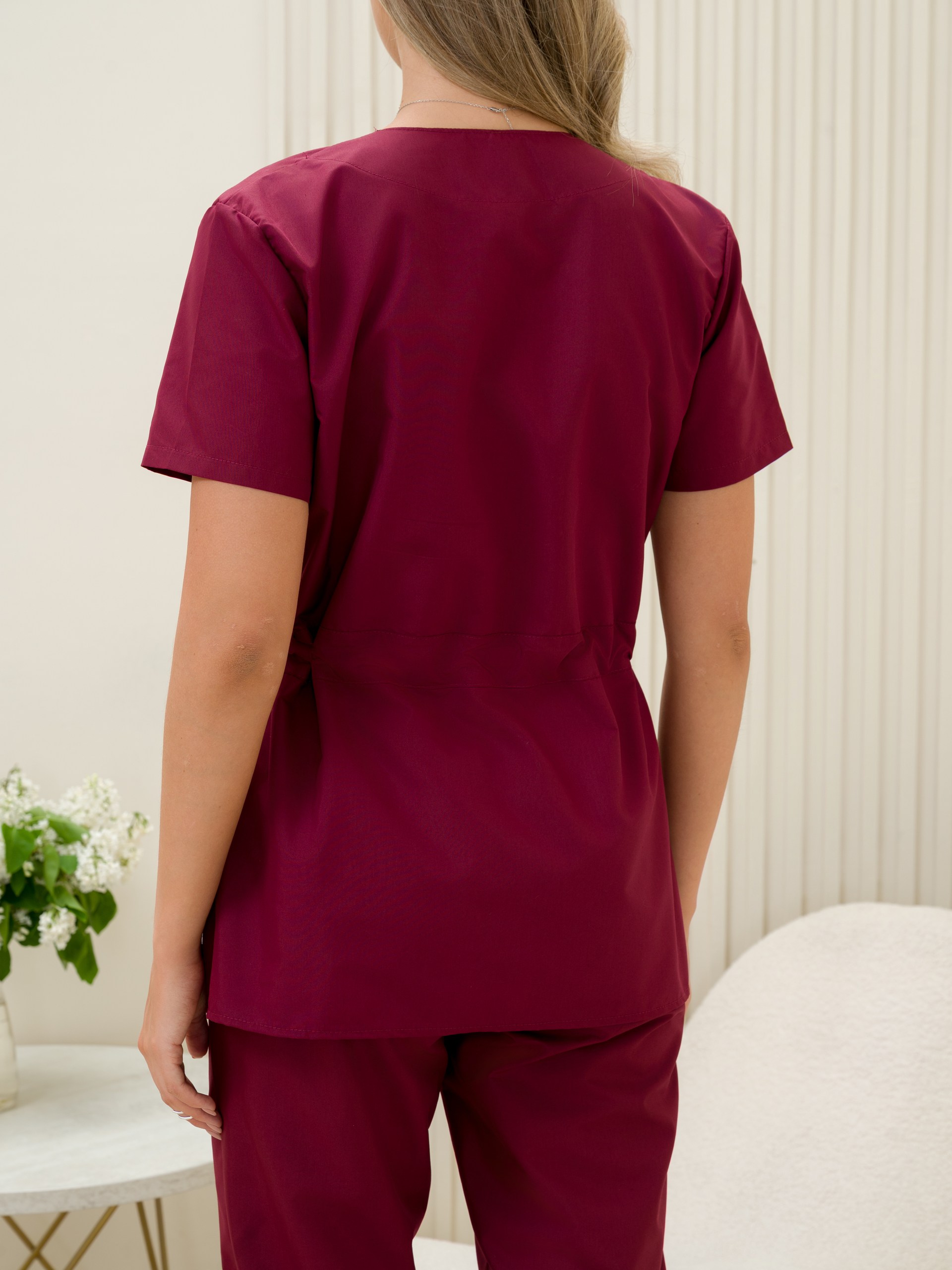 Костюм медицинский жен. М-112-90 ткань Тиси состоит из жакета и брюк. Жакет с короткими рукавами, V-образный вырех, запашной, на кулиске, имеются два боковых накладных кармана. Брюки джоггеры с широкой поясной резинкой.