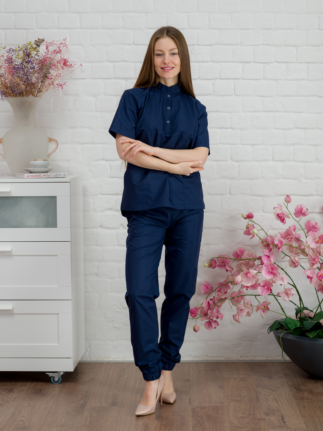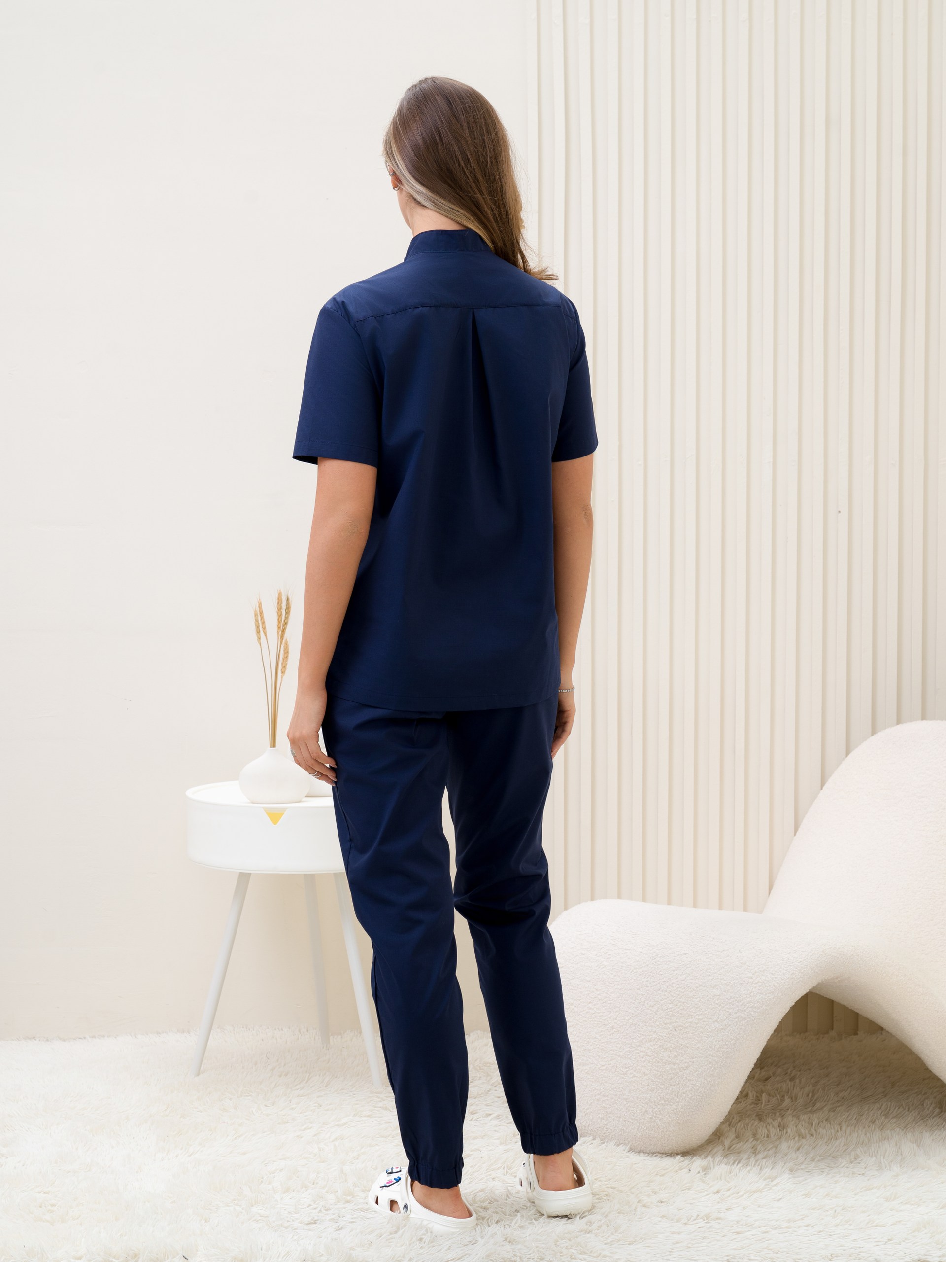 Костюм медицинский женский прямого силуэта, поло. Застежка кнопки, воротник стойка, рукав короткий, 2 накладных кармана, по бокам разрезы. Брюки джоггеры.