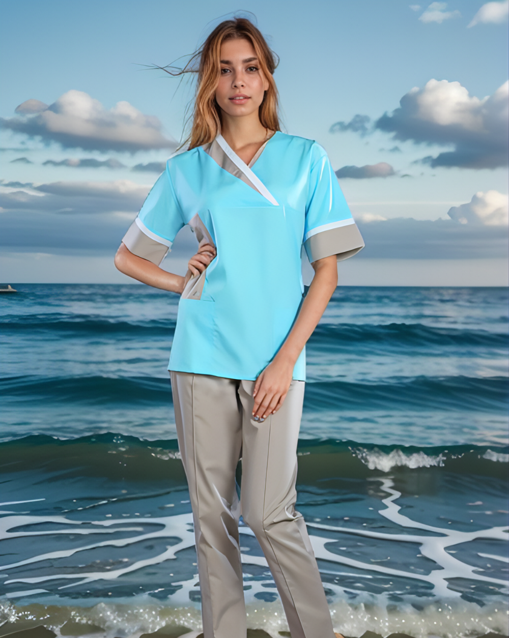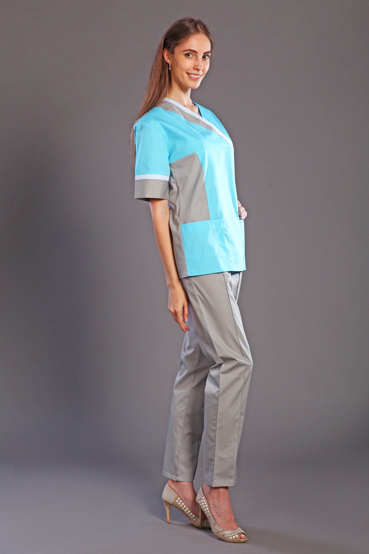 Медицинский женский костюм состоит из блузы с короткими рукавами и брюк. Блуза с эффектным Vобразным вырезом горловины, двумя накладными карманами. Полочка, горловина и манжеты рукавов оформлены вставками из ткани в цвет брюк. Брюки классические, прямые.Изготовлен из ткани ТИСИ, с составом 35% хлопка и 65% полиэфира в плотности 120г/м2. Размерный ряд 42 - 56.
