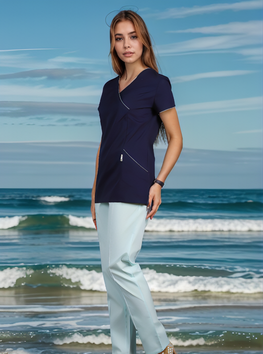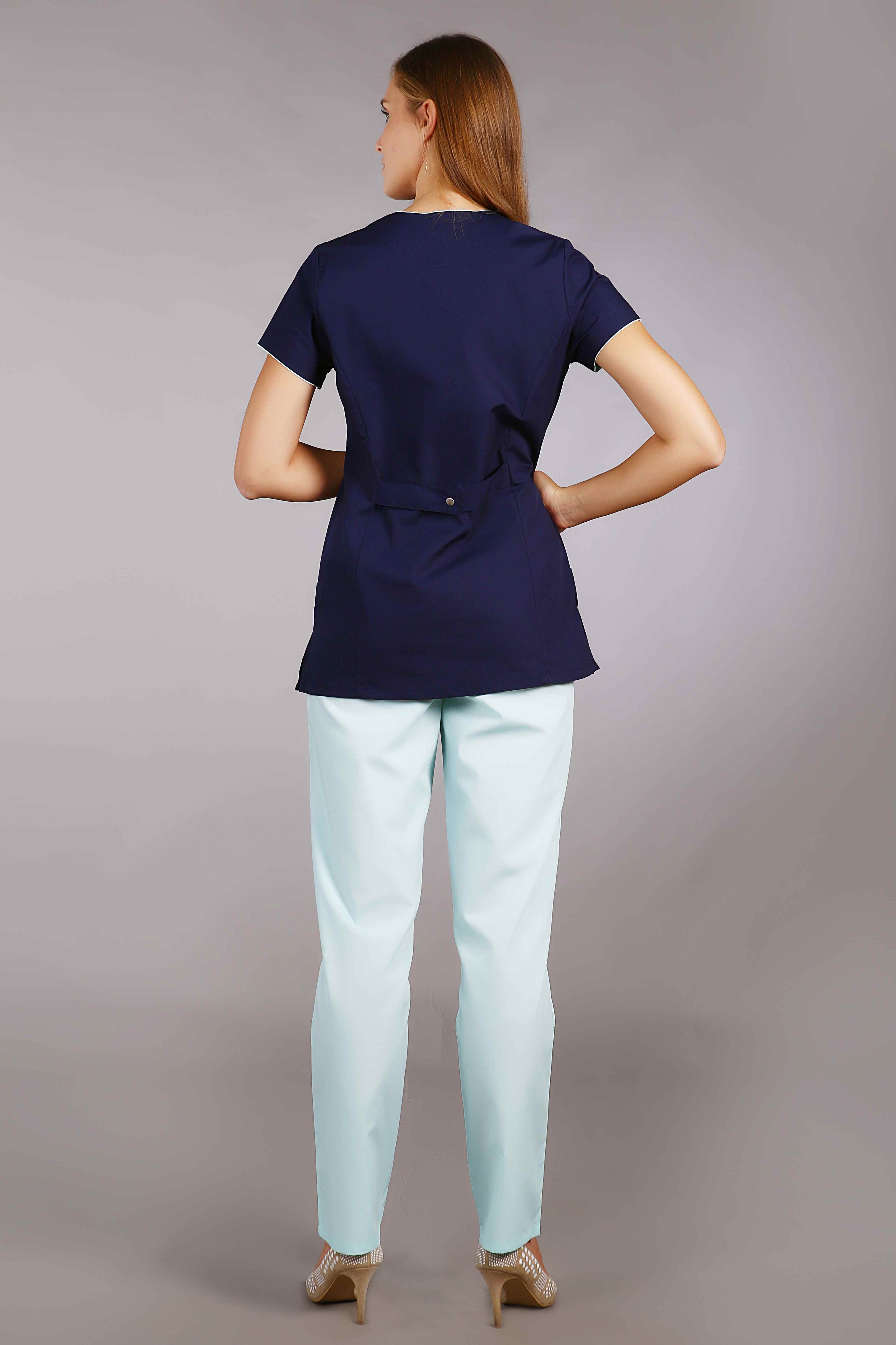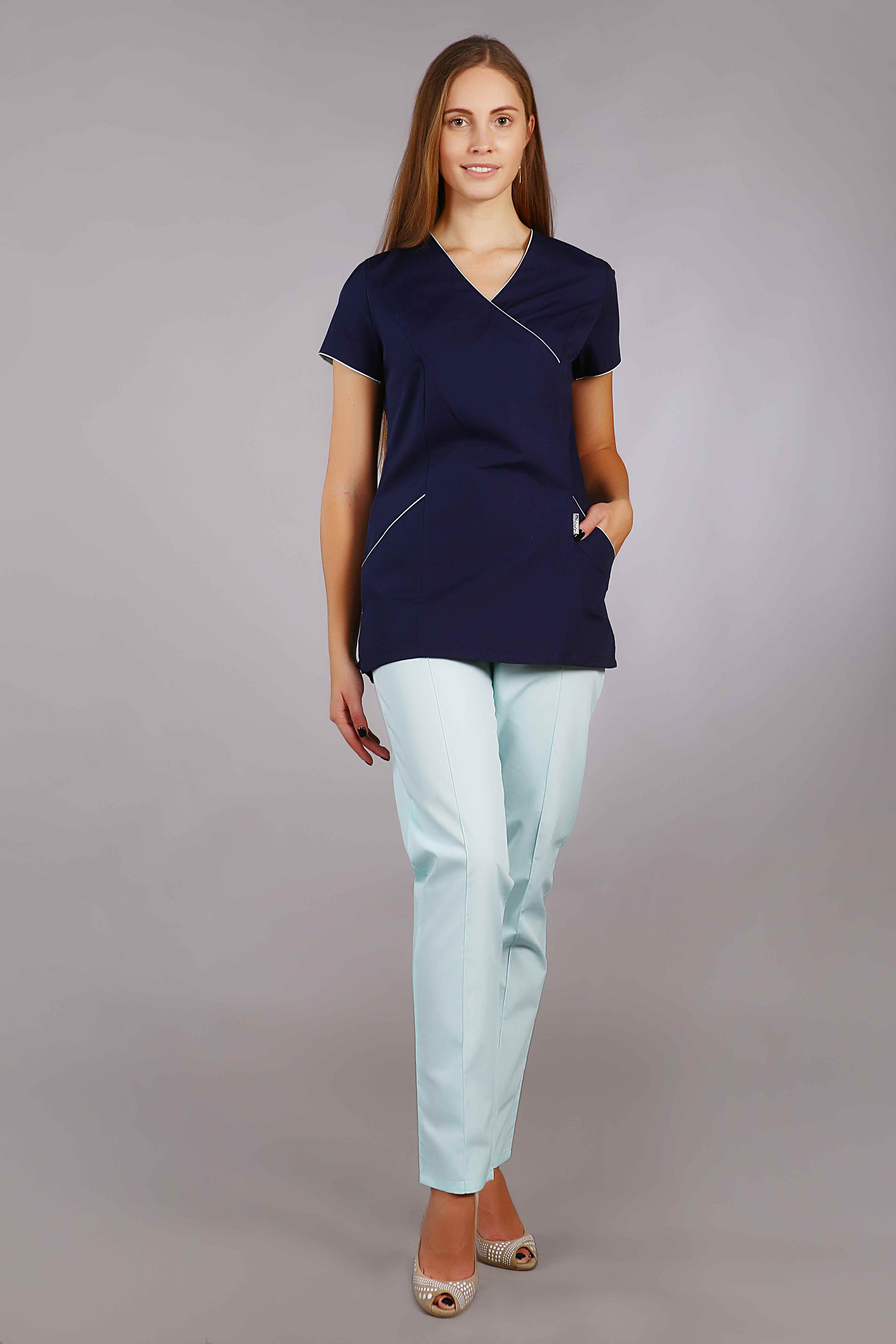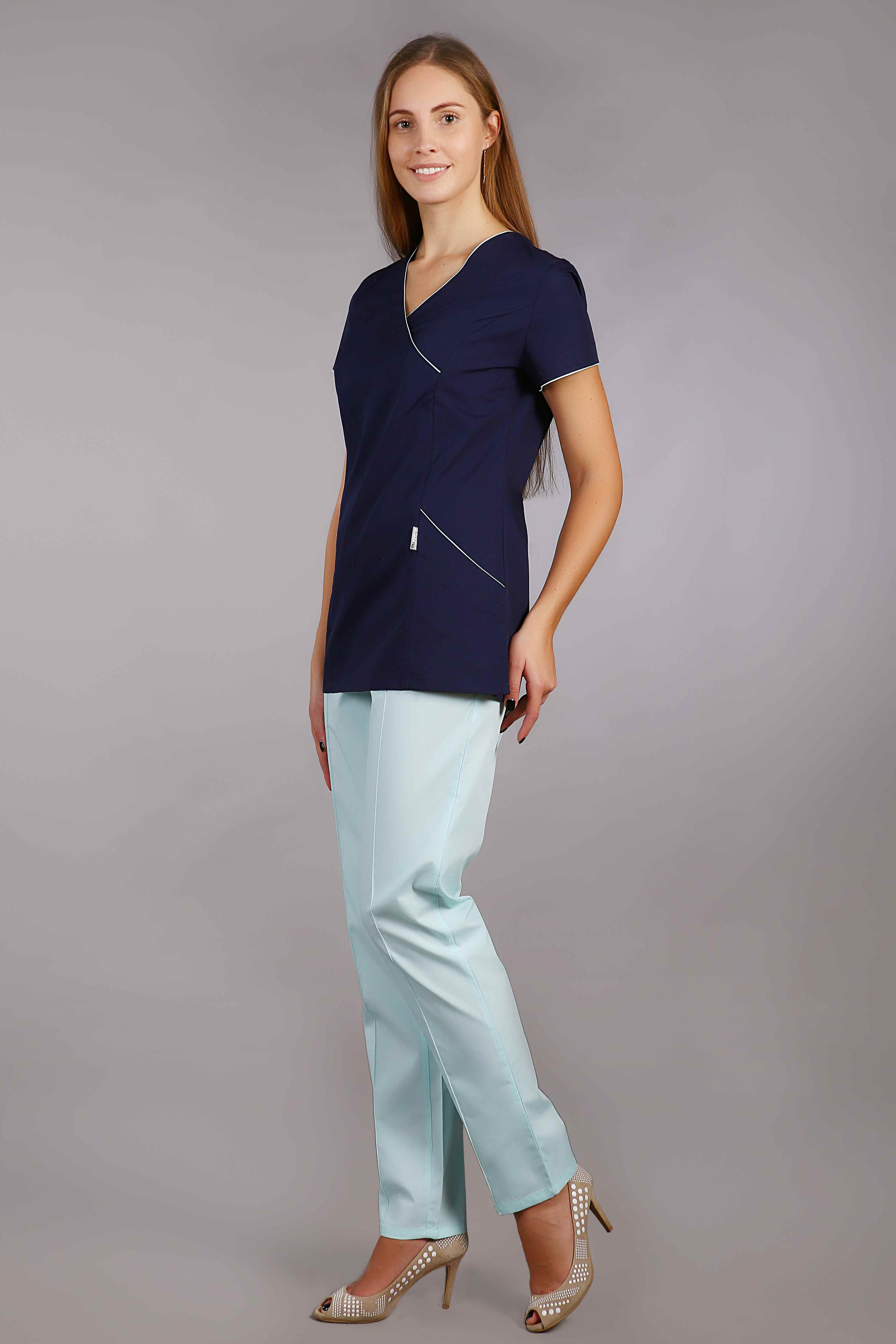 Женский медицинский костюм состоящий из блузы с короткими рукавами и брюк зауженных к низу. Горловина выполнена в виде v-образного выреза,Цвет комбинированный, блуза цвета Черника(63)/ брюки цвета светлая бирюза ( 2 ). Исполнен из ткани ТиСи ( хлопок 35%, полиэстер 65%, ВО пропитка, Плотность: 120 гр/кв.м), размерный ряд 40 - 58, рост 164-170