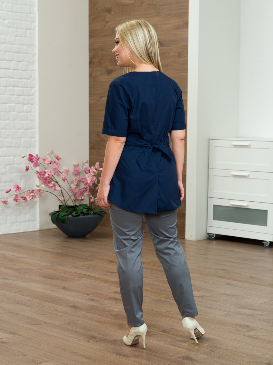 Блуза медицинская с коротким рукавом, приталенного силуэта. Без воротника, горловина-фигурная с разрезом впереди. На полочке фигурный втачной пояс, на спинке пояс завязывающийся он позволяет регулировать прилегание блузы по талии. Имеются два боковых кармана. Размеры: 40 - 54