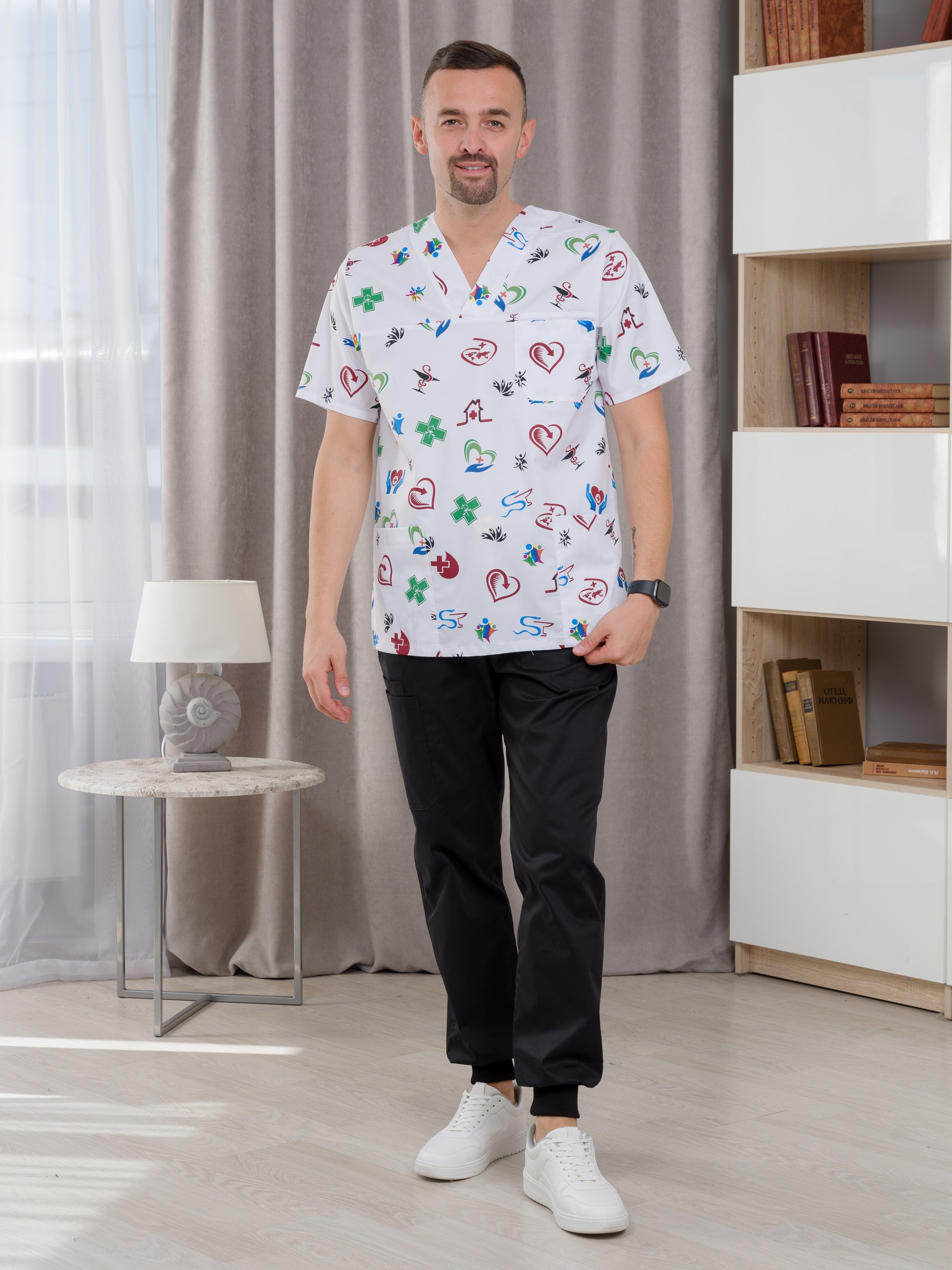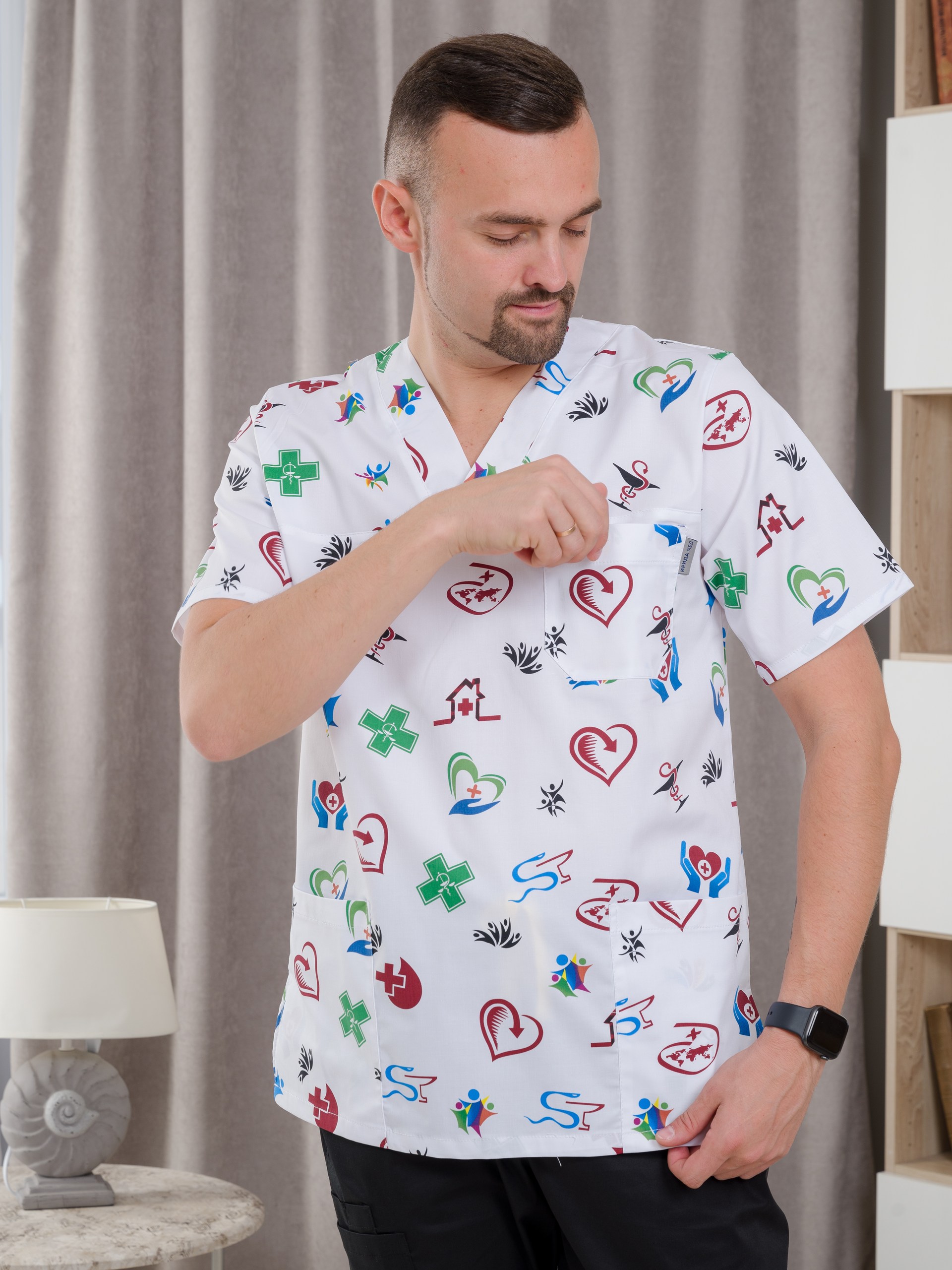 Жакет медицинский хирургический мужской прямого силуэта с V- образной горловиной и коротким рукавом. Наличие трех карманов: два нижних и один нагрудный. Широкие рукава блузы подарят свободу движения и комфорт. Данная модель подходит для следующих категорий использования: рубашка хирурга, врача, медбрата, работника скорой помощи, ветеринара, косметолога, парикмахера, клининга, массажиста. Медицинский жакет представлен размерным рядом с 44/46 по 64/66. Спецодежда сшита из ткани Стрейч/Принт с составом ткани (35%хл, 63%п/э,2%эластан). Это спецодежда высокого качества для специалистов с хорошим вкусом.